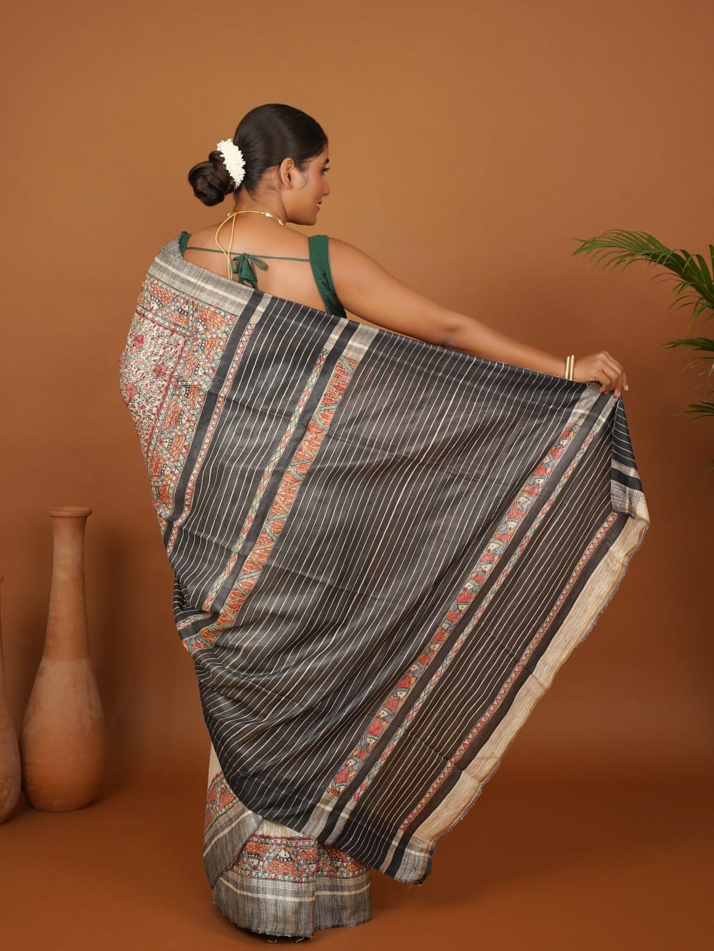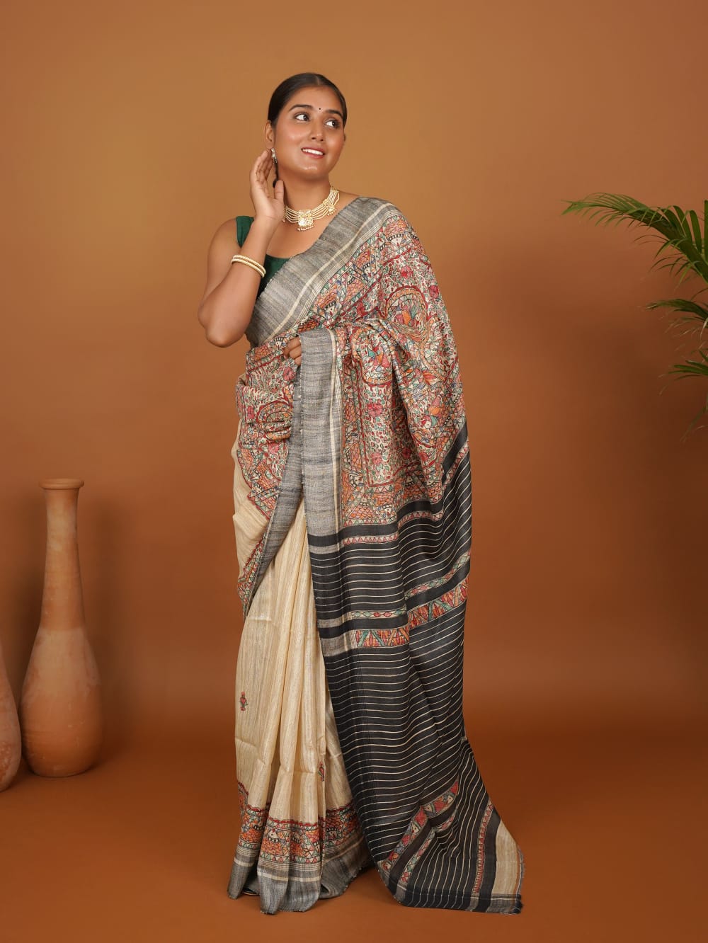 The striking contrast of the black striped pallu, punctuated with subtle Madhubani bands, creates a balanced fusion of traditional storytelling and modern appeal. The beige body of the saree has soft hand-drawn accents, allowing the art to speak without overwhelming the elegance of Ghicha silk’s natural sheen.
