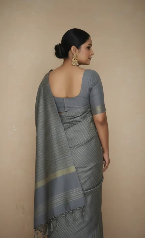 A refined handwoven cotton saree in soft slate blue with gentle grey and sage accents, created for calm elegance and breathable everyday wear.