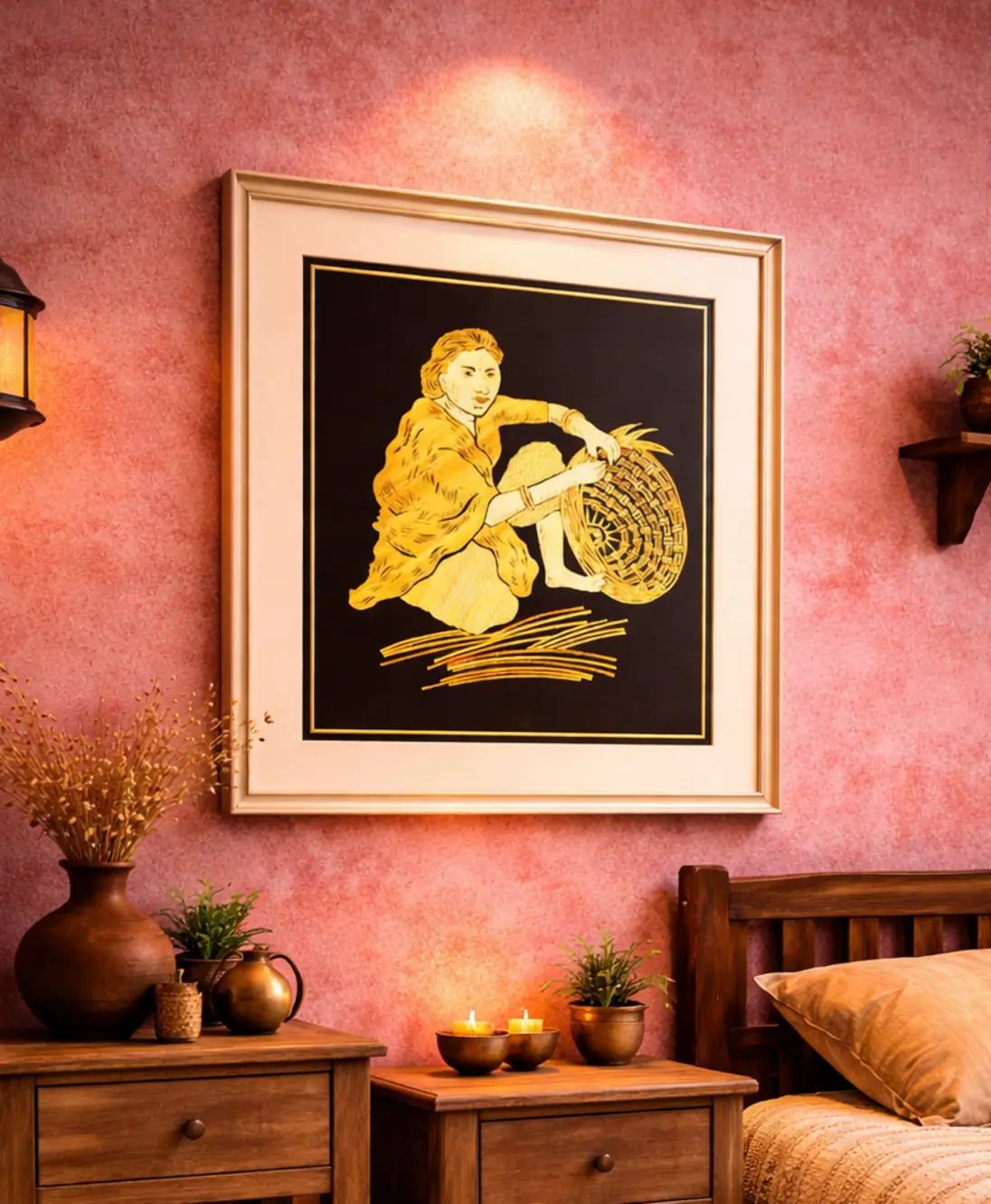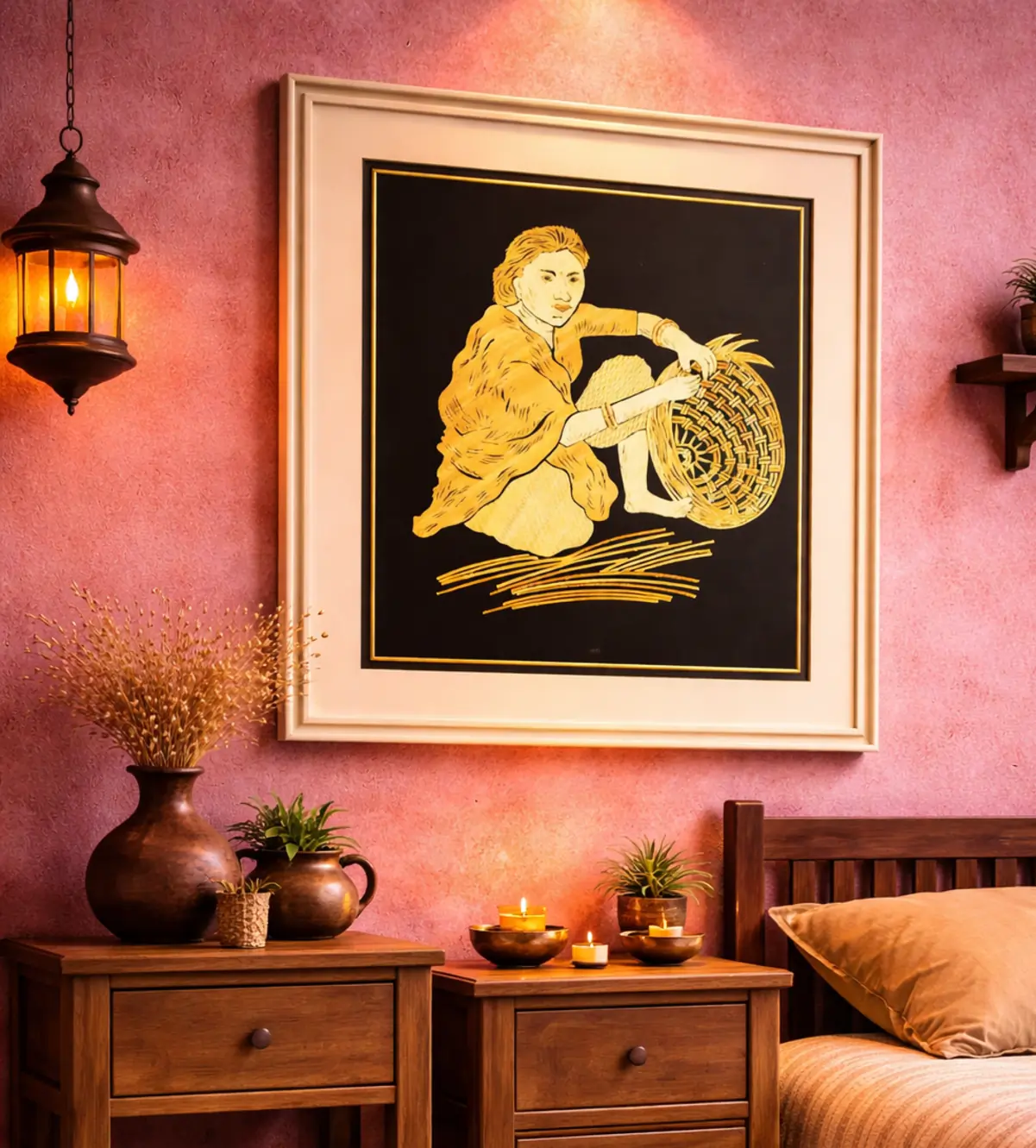 This handcrafted painting is inspired by the traditional Sikki grass craft of Bihar, portraying a village artisan weaving with patience and skill. Created with fine hand-painting techniques in warm golden tones on a deep black background, it celebrates cultural heritage and simplicity, making it perfect for adding an earthy artistic charm to modern homes.