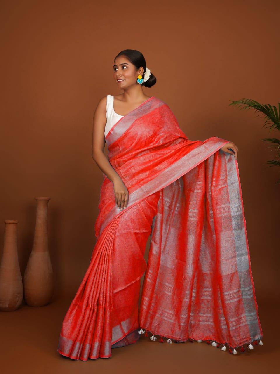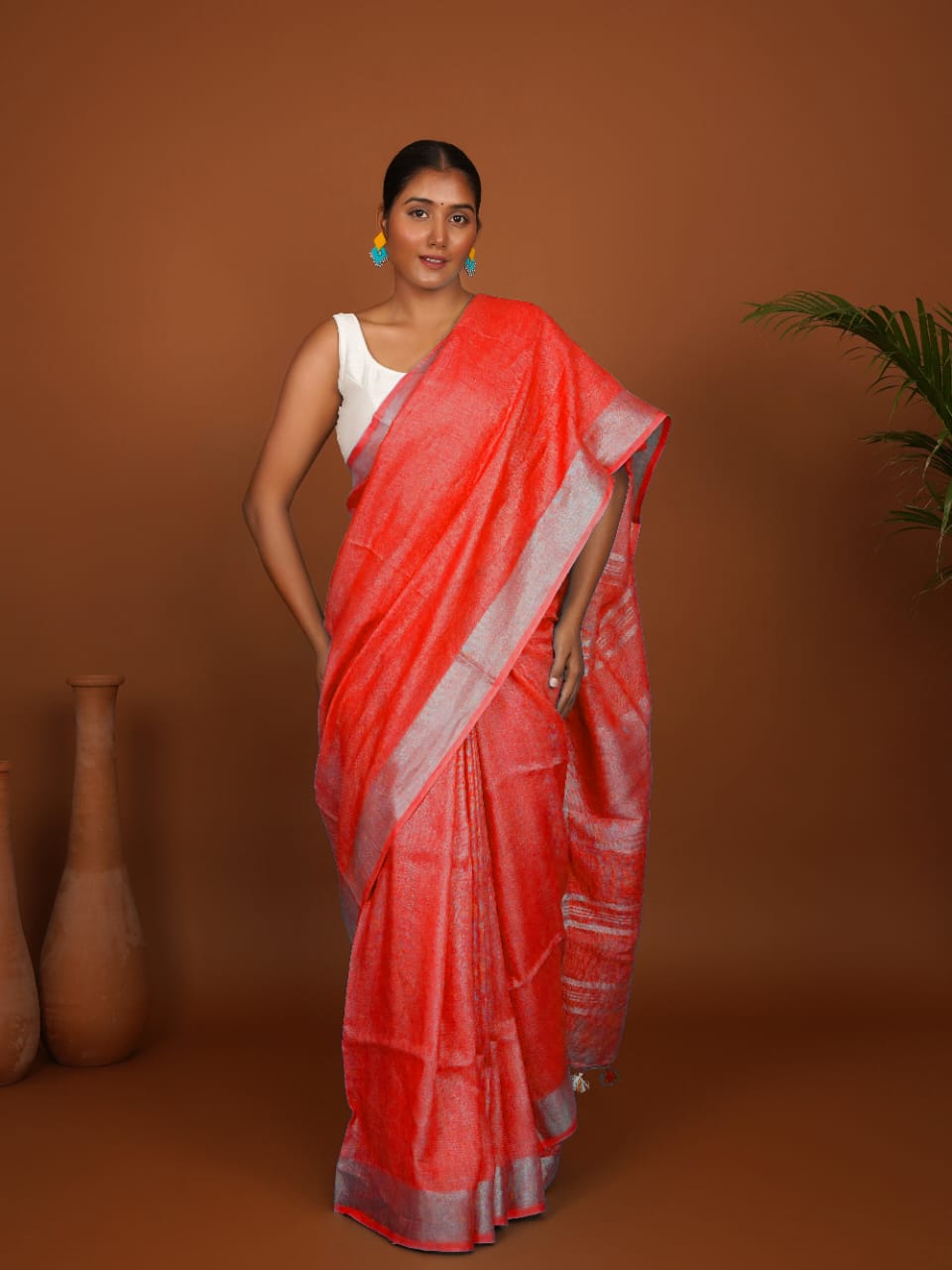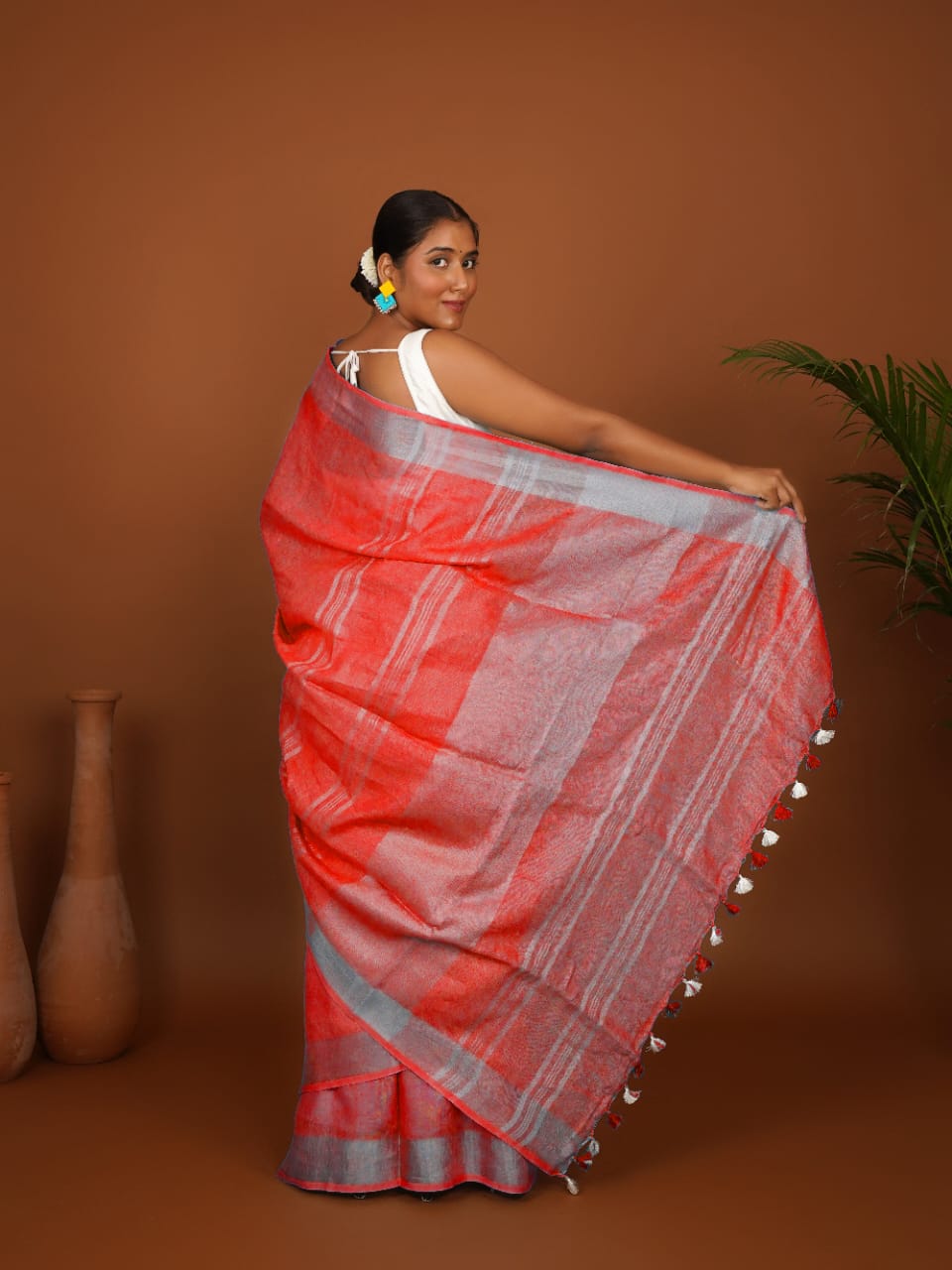 Sindhura Rekha Coral Red Handwoven Linen Saree