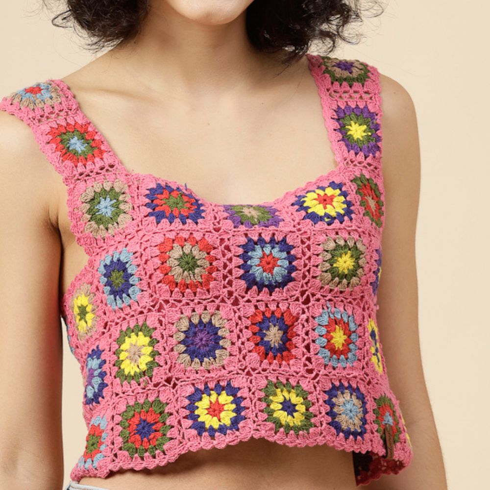 Step into the sunshine with this playful patchwork crochet crop top crafted in a cheerful pink base with multicolor granny square motifs. Each square is hand-crocheted with bursts of color—like mini mandalas—giving the piece a joyful, vintage-meets-modern feel. The wide shoulder straps and flattering neckline offer both comfort and a cute silhouette that complements high-waisted jeans, skirts, or even sarees for a fusion look.