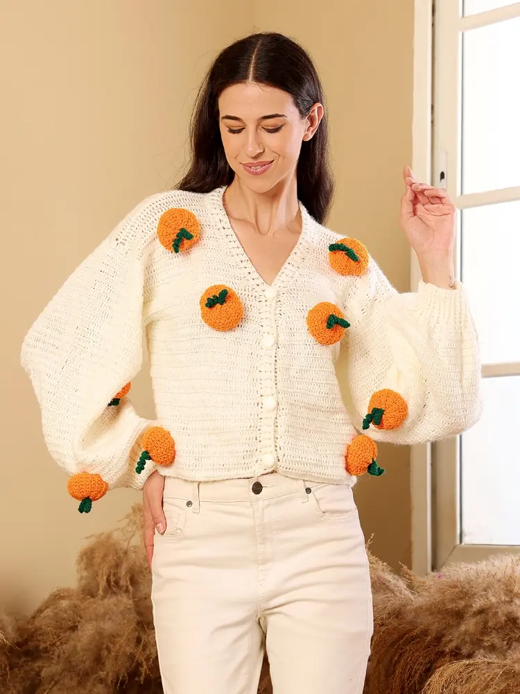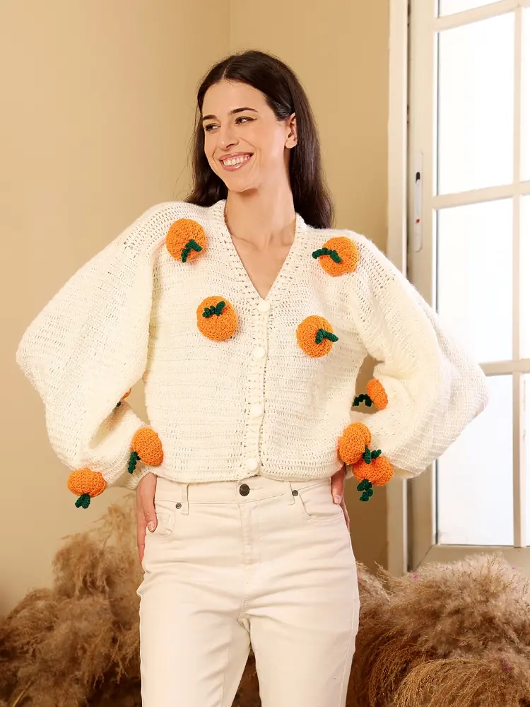 This hand-crocheted sweater is carefully made by skilled artisans using premium yarns on traditional crochet techniques. The soft ivory base with vibrant citrus-inspired motifs adds a joyful, contemporary touch. Designed for comfort and individuality, each piece is handcrafted slowly, making every sweater truly one of a kind.