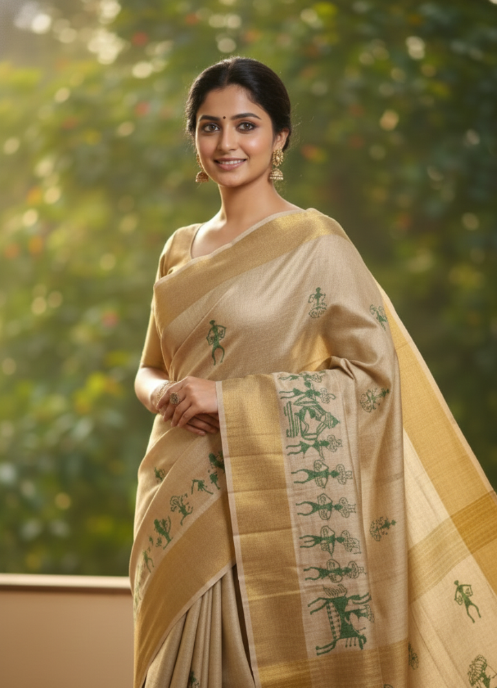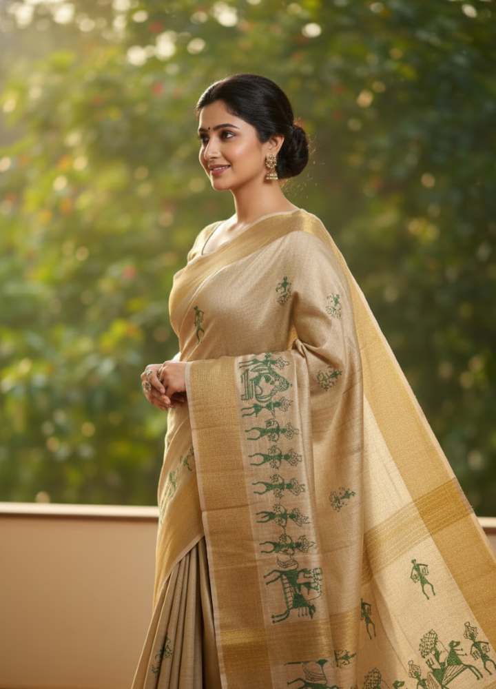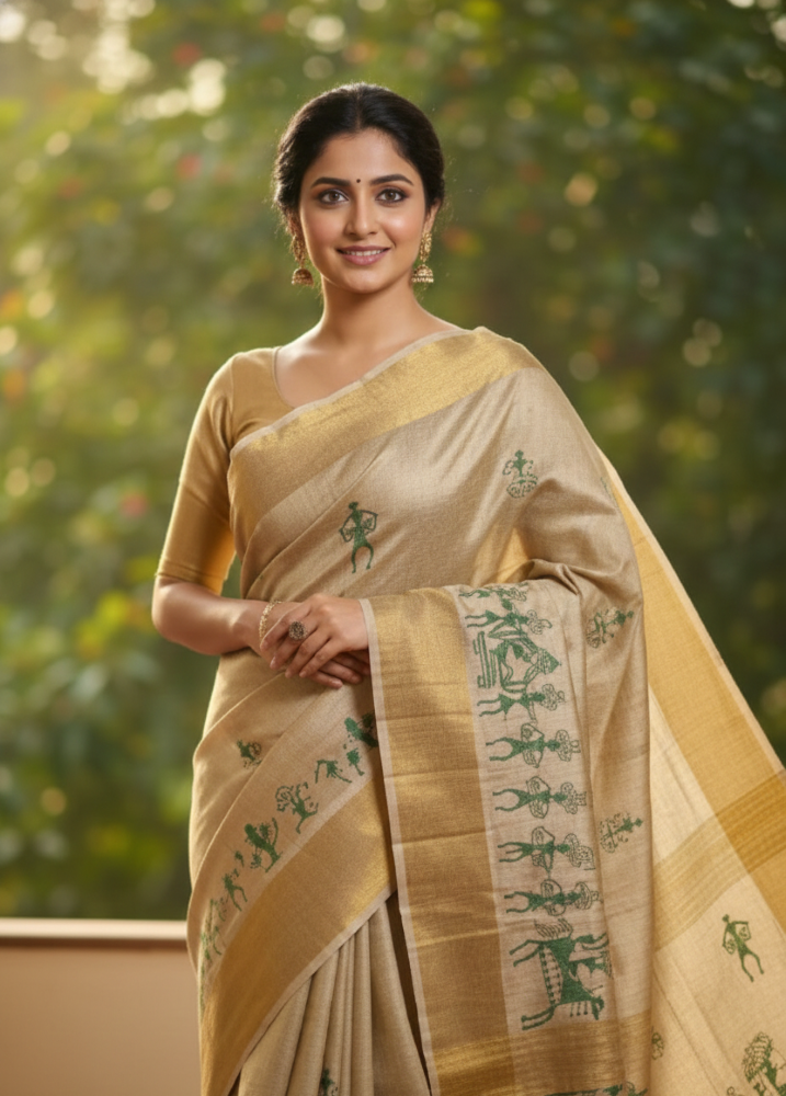 A serene handwoven Kosa silk saree adorned with delicate folk motifs, crafted for understated elegance and cultural grace.