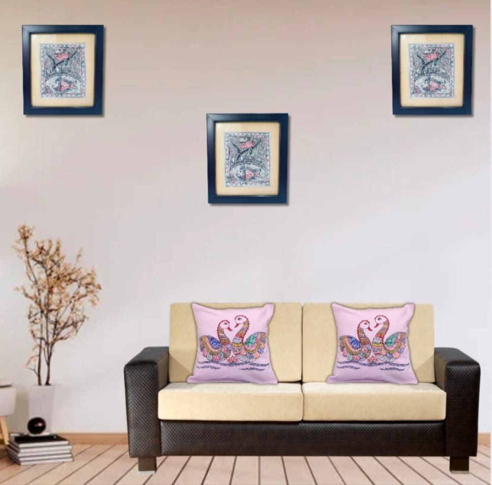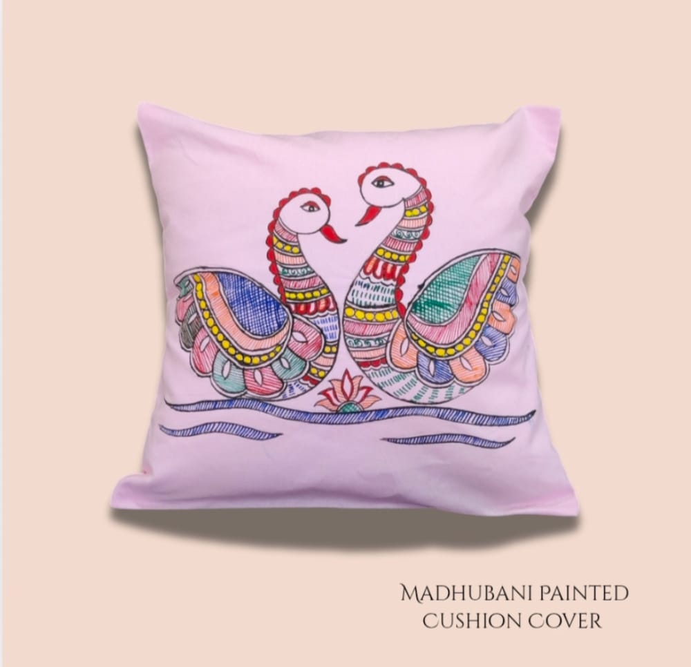 This cushion cover features a pair of swans, delicately painted in vibrant hues, gliding across stylized waves. The clean composition and calming palette make it an elegant choice for subtle yet artistic decor. Made from 100% pure cotton.