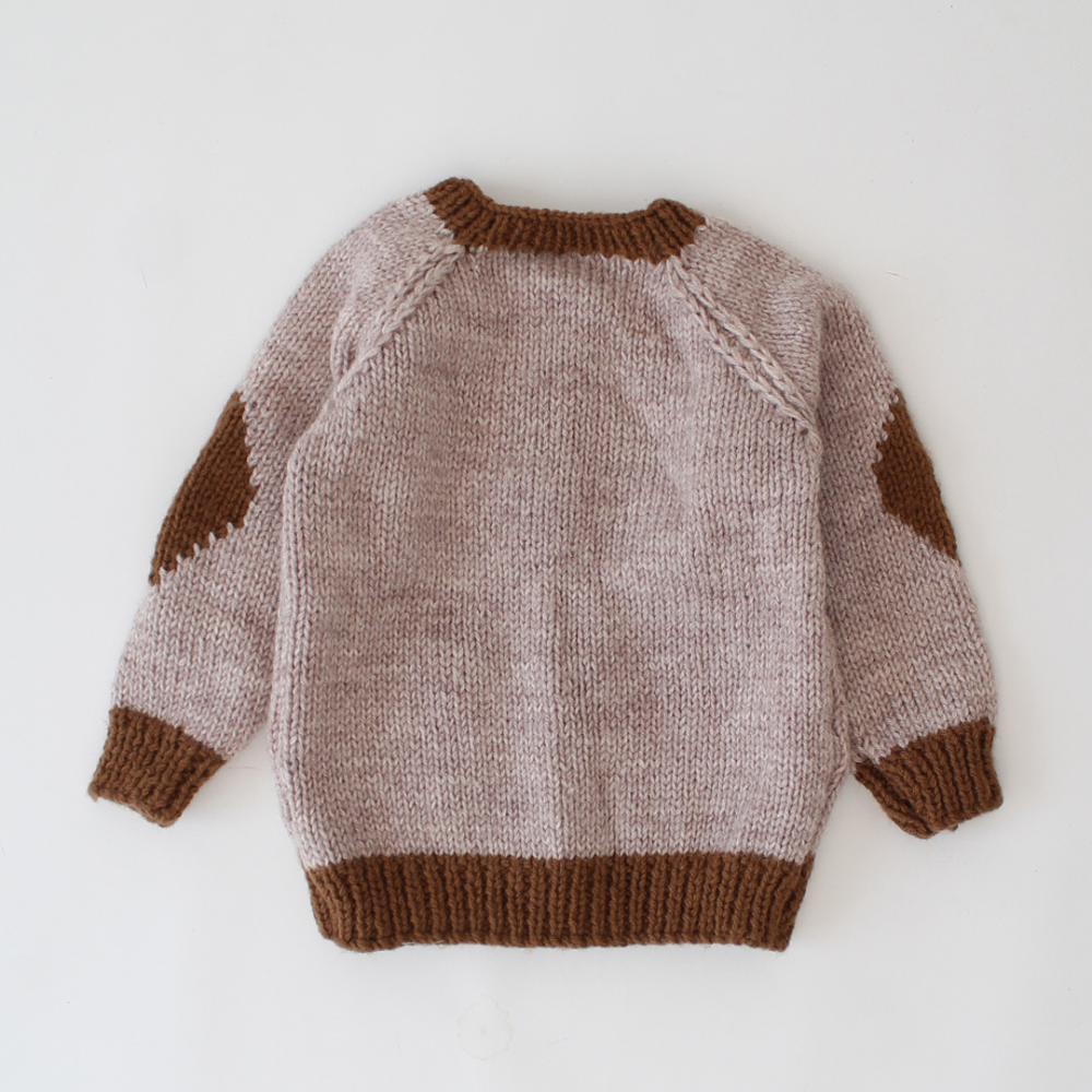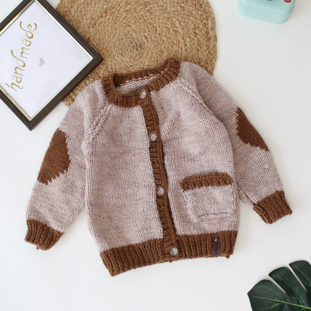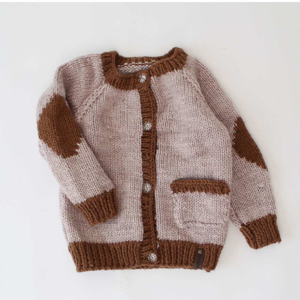 The sweater is a knitted cardigan with a color-block design. It combines a soft dusty tan beige color for the main body and sleeves, with contrasting dark brown sections at the cuffs, bottom hem, and elbow patches. But what truly catches the eye are the wide bands of deep brown that adorn the lower half of both sleeves. These contrasting bands add warmth and character to the design. Additionally, there are two functional pockets on the front at the bottom half of the cardigan, aligning with the brown color block design.