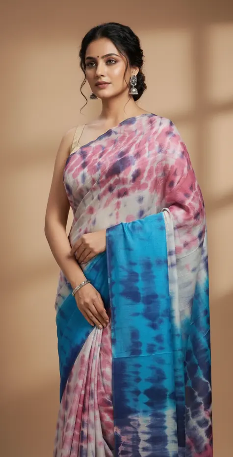 This handwoven tie & dye saree is crafted by skilled artisans using traditional resist-dye techniques on lightweight cotton fabric. The graceful blend of blush pink, ivory, and teal blue creates a calming yet contemporary look, making it perfect for workdays, casual gatherings, and relaxed festive wear. Each saree carries organic dye patterns, ensuring every piece is unique.