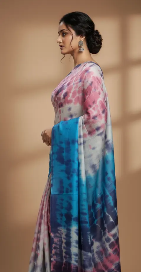A soft, artistic handwoven tie & dye saree that blends soothing hues with breathable comfort for modern everyday elegance.