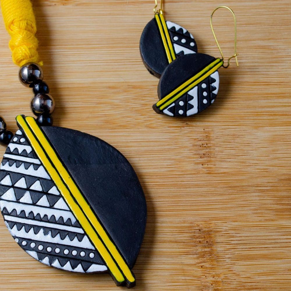Twirl into style with this enchanting terracotta set. The unique design, featuring a playful swirl of patterns and colors, is sure to captivate all eyes. This handcrafted set, comprising a necklace and earrings, is the perfect addition to your boho wardrobe.
