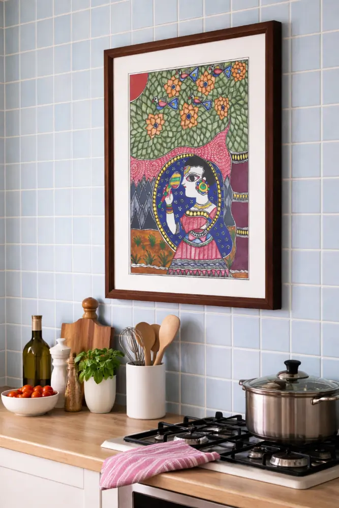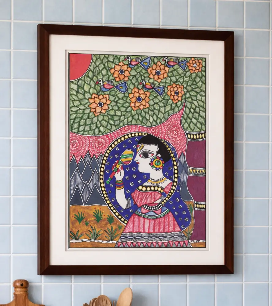 A graceful Madhubani artwork capturing feminine elegance and cultural heritage.