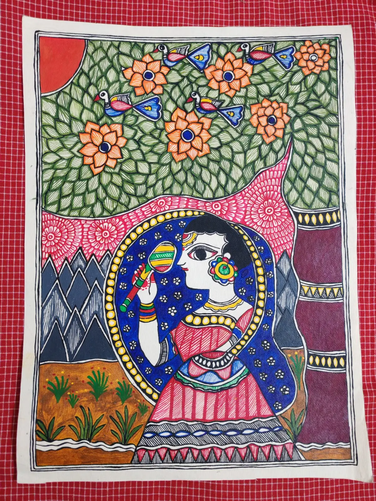 This beautiful Madhubani painting portrays a traditionally dressed woman holding a symbolic object, reflecting grace, beauty, and everyday life in Mithila culture. Surrounded by nature-inspired elements and intricate detailing, the artwork tells a story of tradition, identity, and artistic expression rooted in rural India.