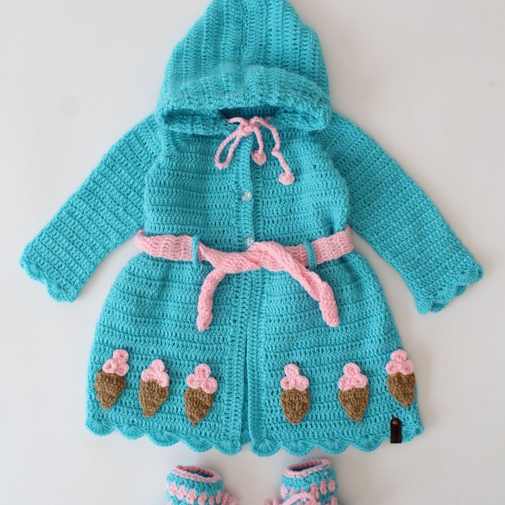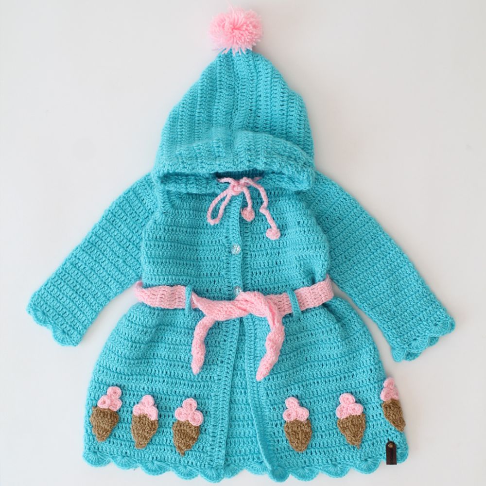 Turquoise Blue Colored With Knitted and Ice Cream Emboidery Hooded Sweater Set