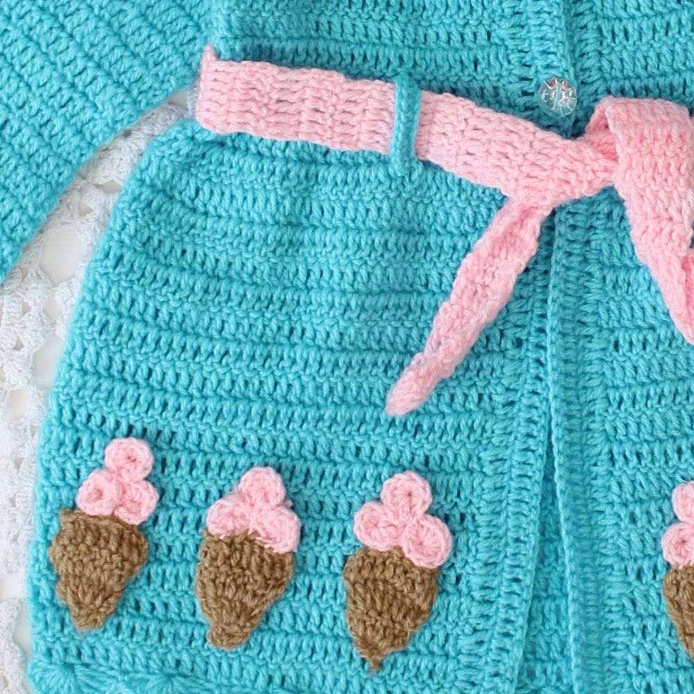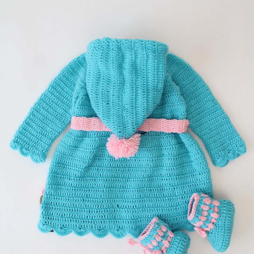 The sweater features an A-line silhouette, flaring out gently towards the hem. It’s designed with long sleeves and scalloped edges at the cuffs and hem, adding a touch of whimsy.Completing this ensemble are matching turquoise booties with pink straps, adorned with tiny bows. The entire set exudes playfulness and warmth – perfect for a little one.