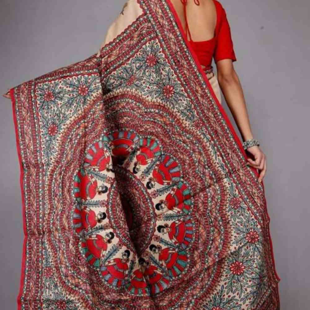 Tussar Ghicha Madhubani Hand-Painted Aanchal Border Saree in Red
