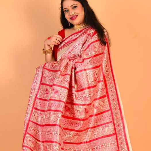 Discover the elegance of tradition reimagined with our Tussar Silk Saree, featuring hand-painted Madhubani artwork. The striking motifs, depicting folklore, flora, and fauna, are delicately crafted by skilled artisans, making each saree a unique work of wearable art. The natural sheen of Tussar silk enhances the vibrancy of the Madhubani art, adding a sophisticated allure to your ethnic wardrobe.