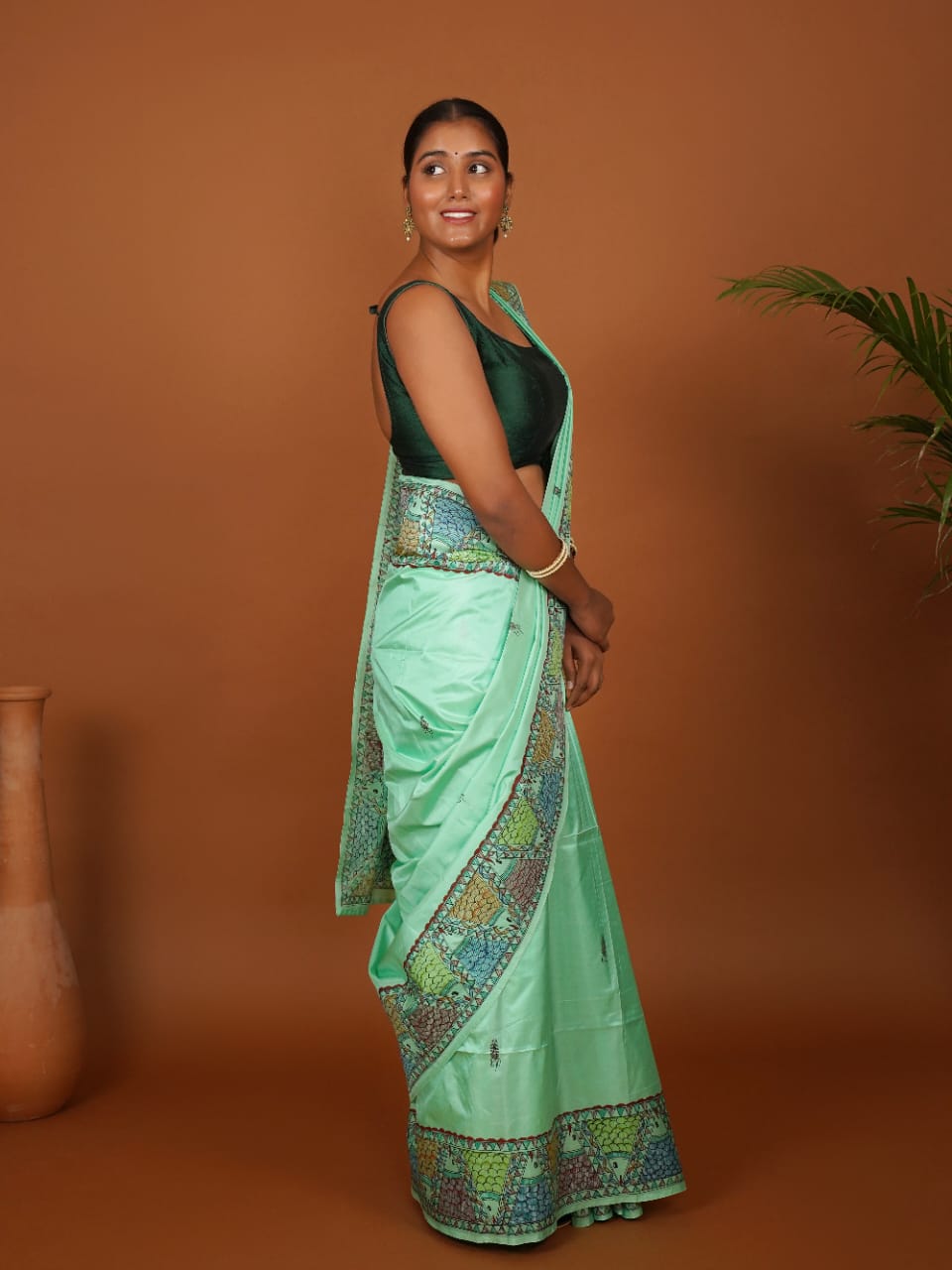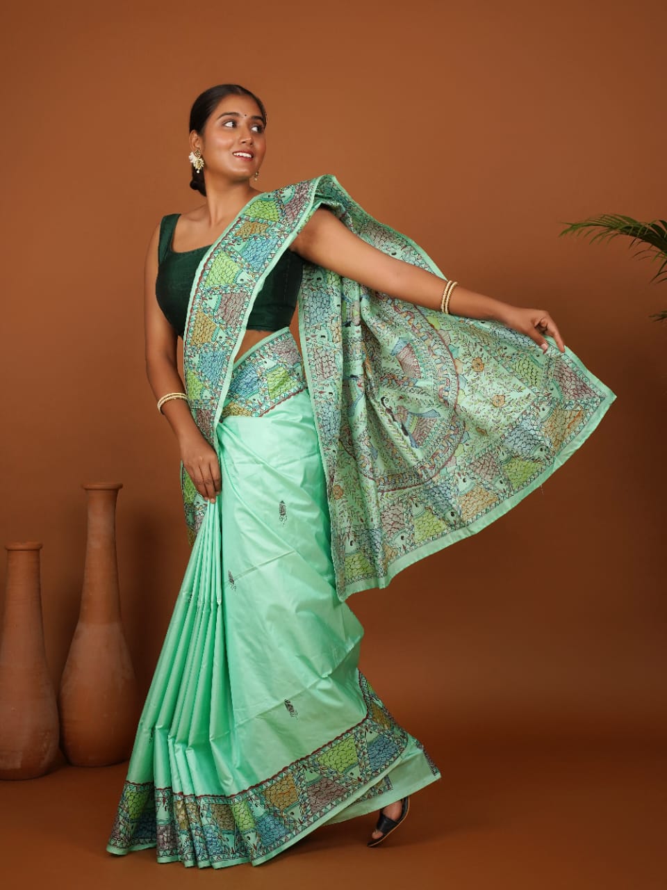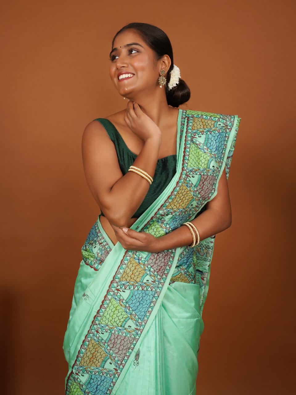 Upvan Leela – Handpainted Mint Green Madhubani Tussar Silk Saree with Fish Border