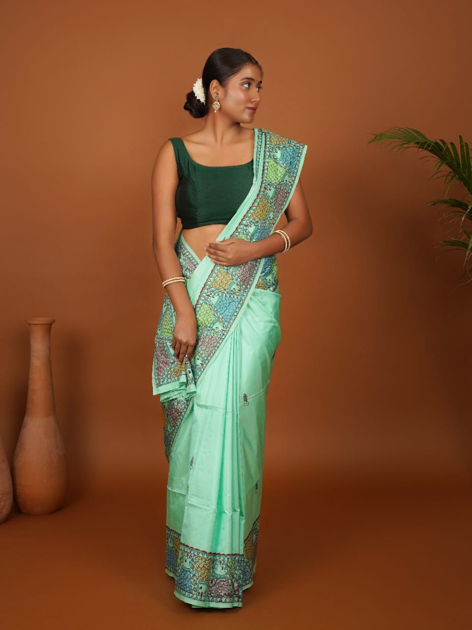 Step into timeless elegance with “Upvan Leela”, a stunning handpainted Madhubani saree on mint green Tussar silk. This saree beautifully narrates the essence of Mithila through its intricate design. The anchal (pallu) depicts a blooming garden (upvan) scene where women are portrayed engaging in various traditional and cultural activities, showcasing daily village life with grace and storytelling.