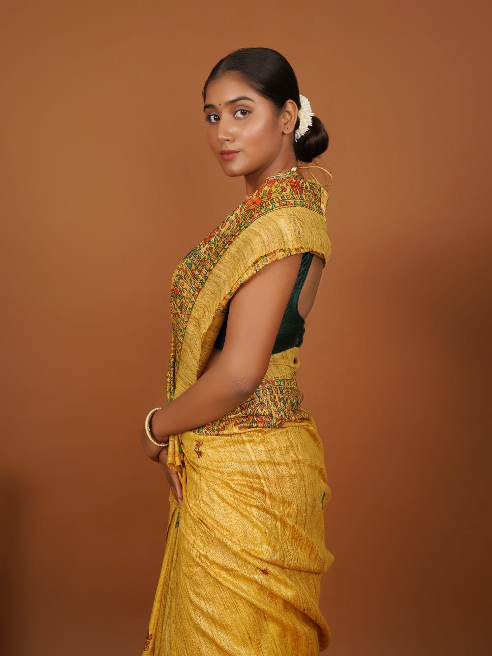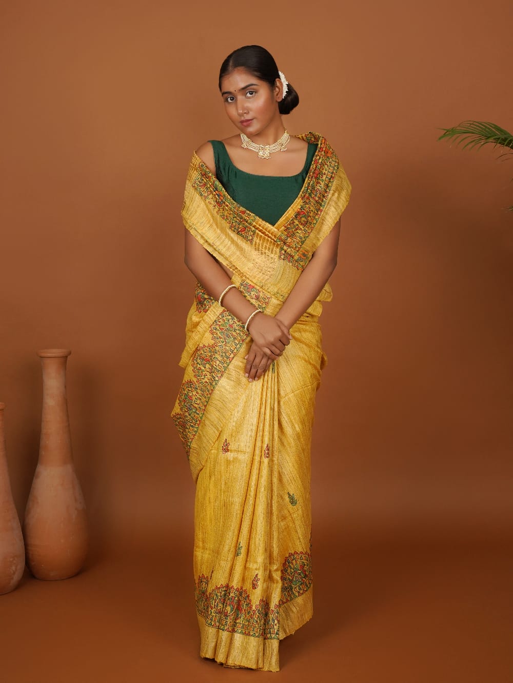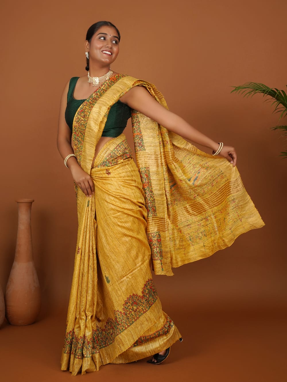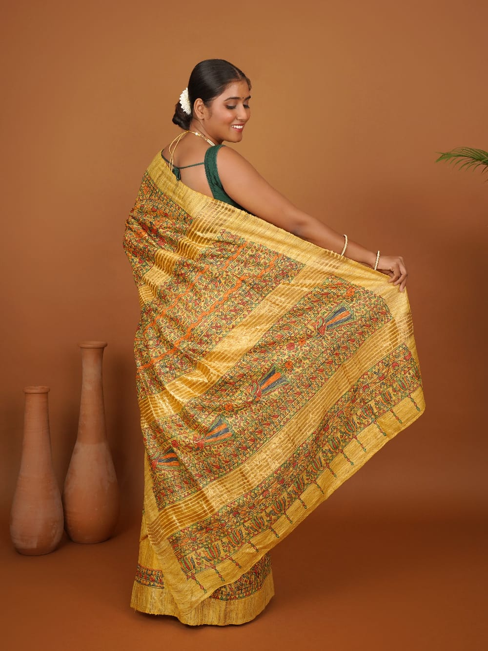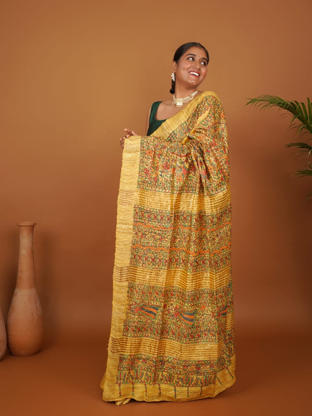 Vanmaya” is a radiant ode to nature, handpainted on lustrous mustard Ghicha silk using traditional Madhubani techniques. The saree features horizontal panels of intricately detailed motifs — from blooming florals and geometric borders to elegant birds, fish, and vines — painted in earthy tones of red, green, and black with natural dyes.
