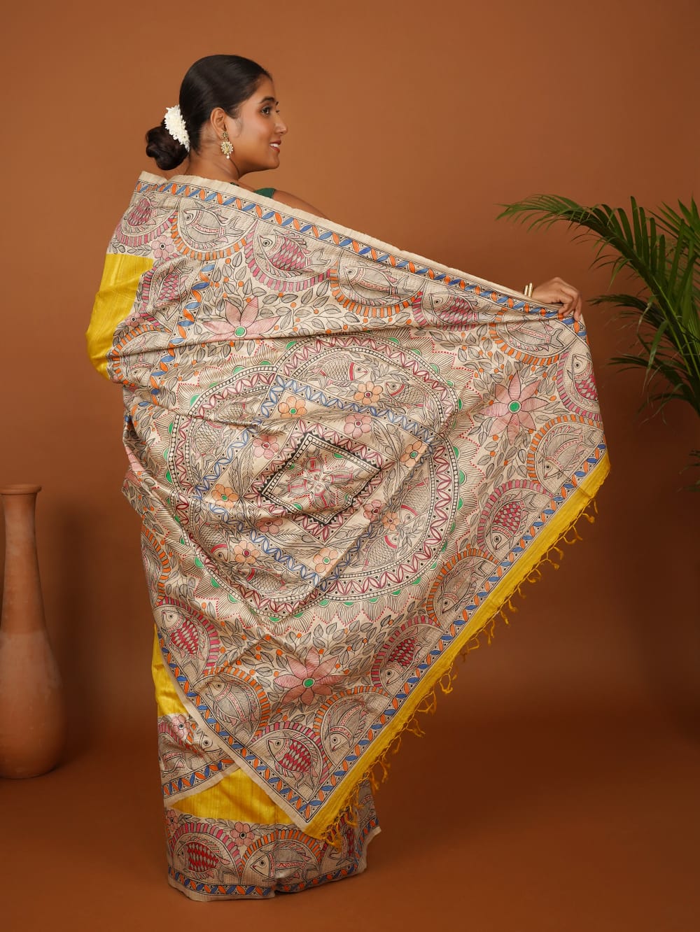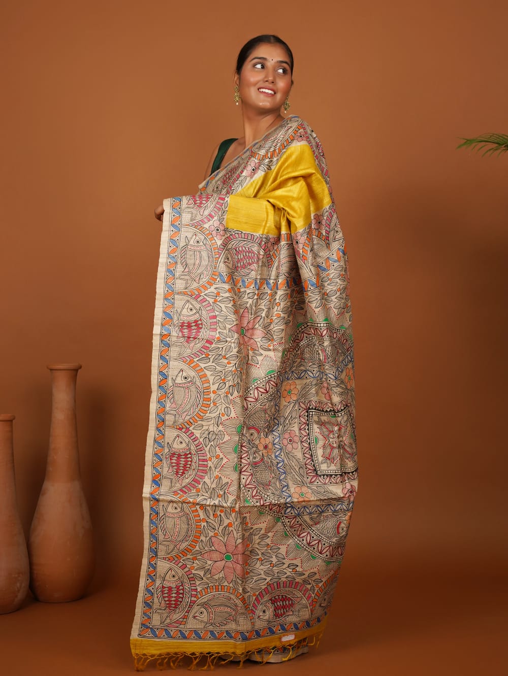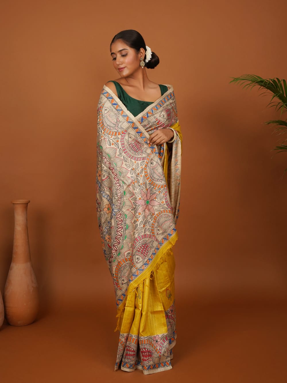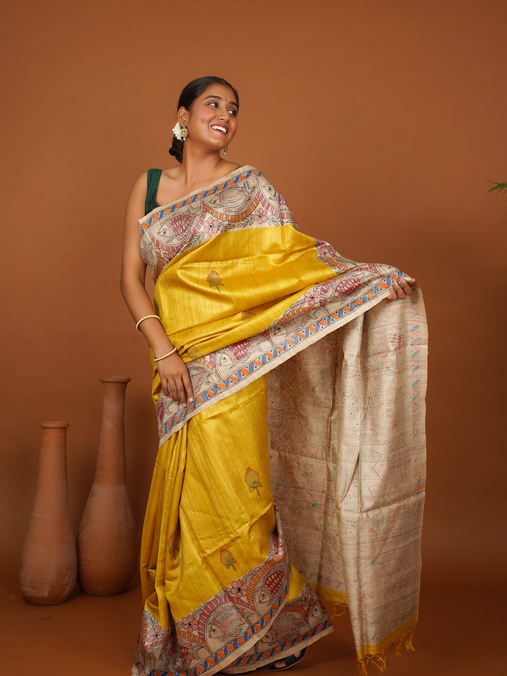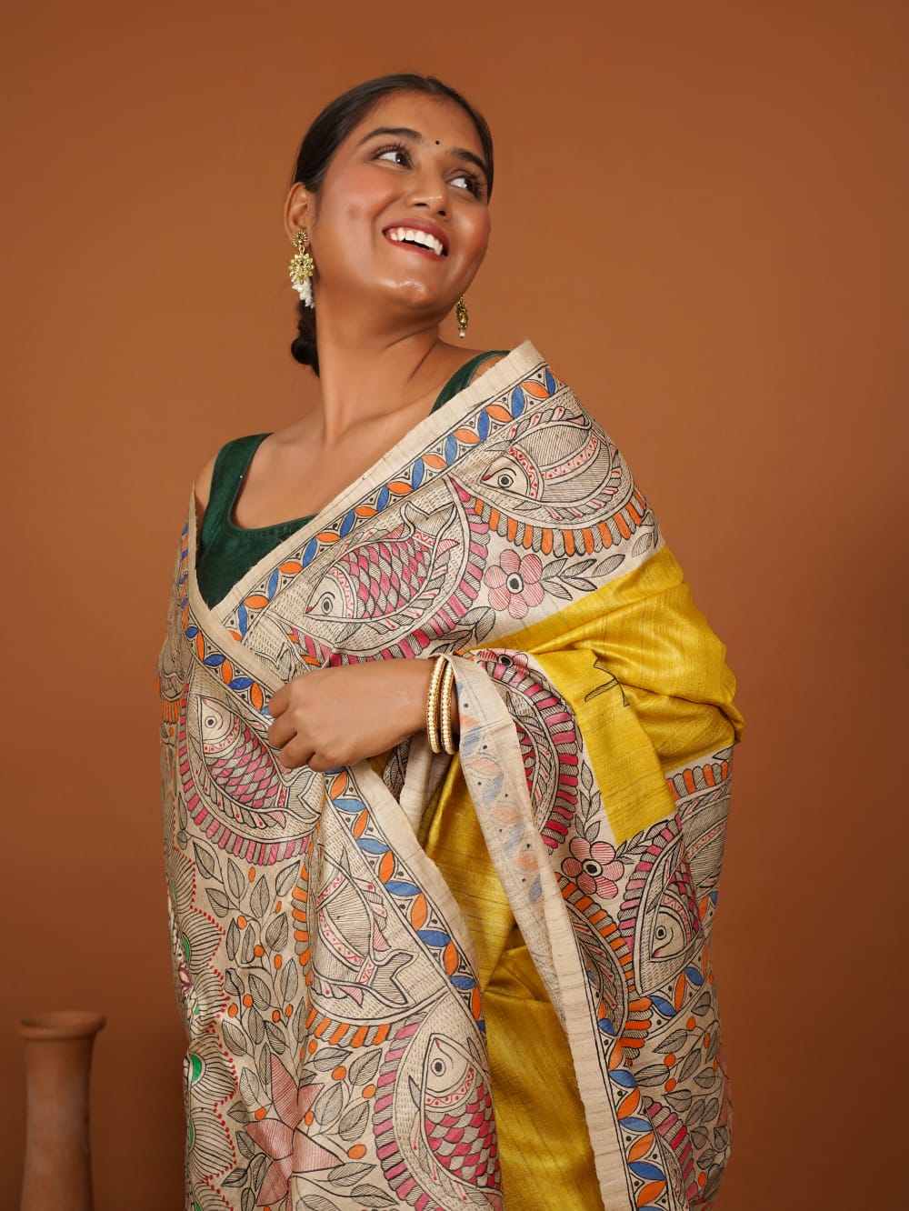 Vanraj Madhubani Painting Tussar Silk Saree – Golden Glow of Nature’s Symphony