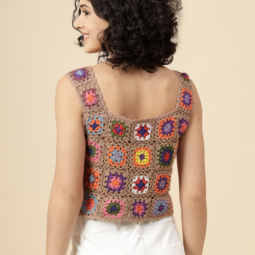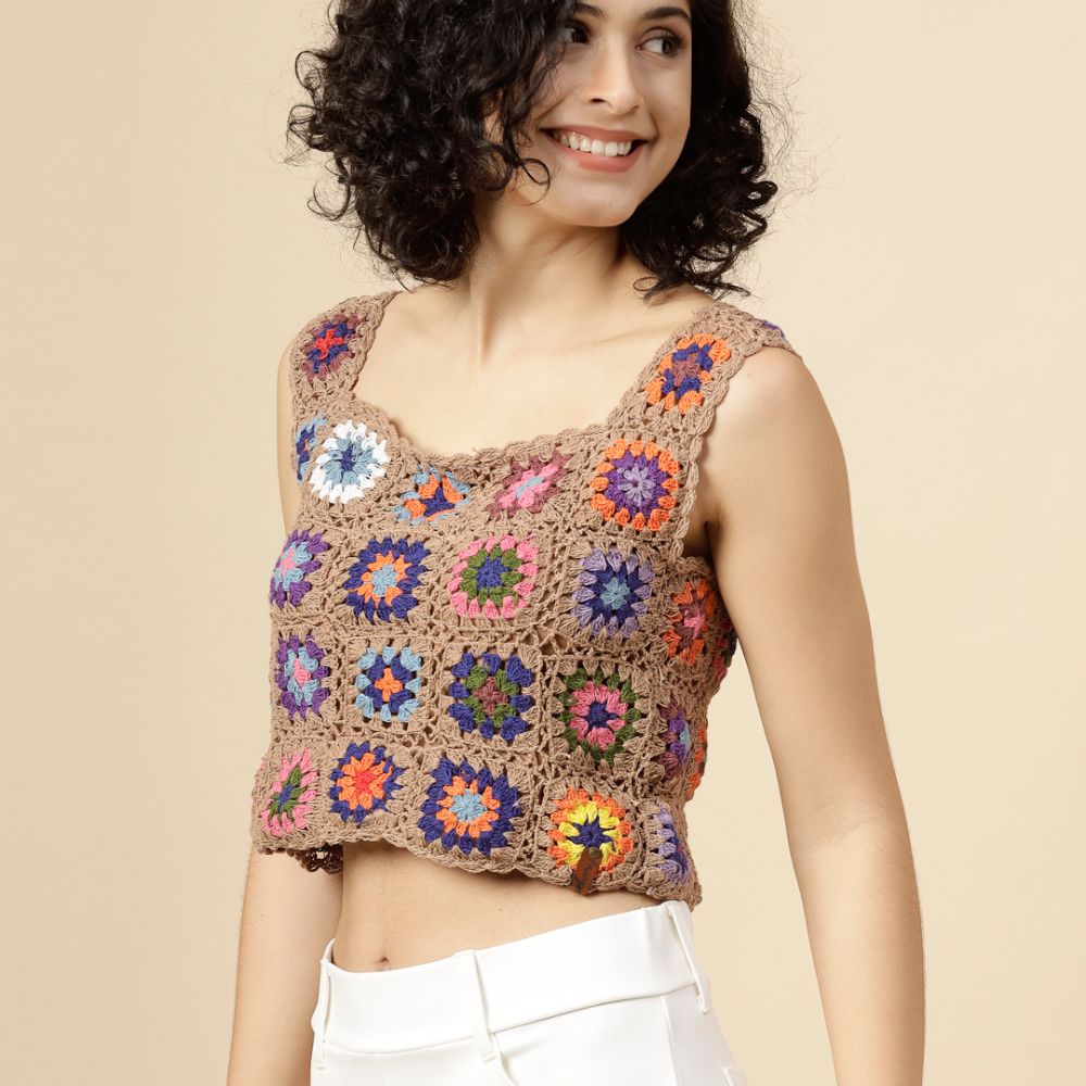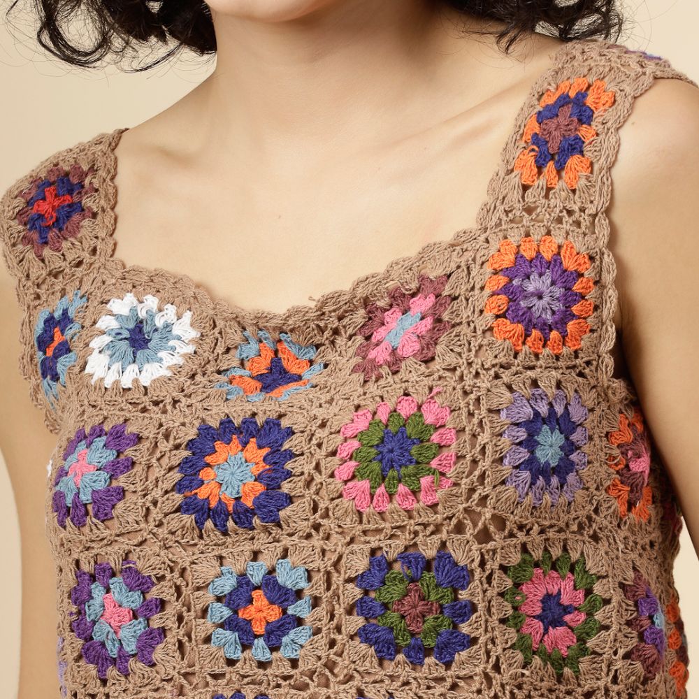 Effortlessly chic and timeless, the Velvery Beige Crochet Crop Top is a versatile addition to your boho-inspired wardrobe. Hand-knitted with intricate self-design patterns, this sleeveless top is crafted from soft, breathable yarn that drapes beautifully on the body.