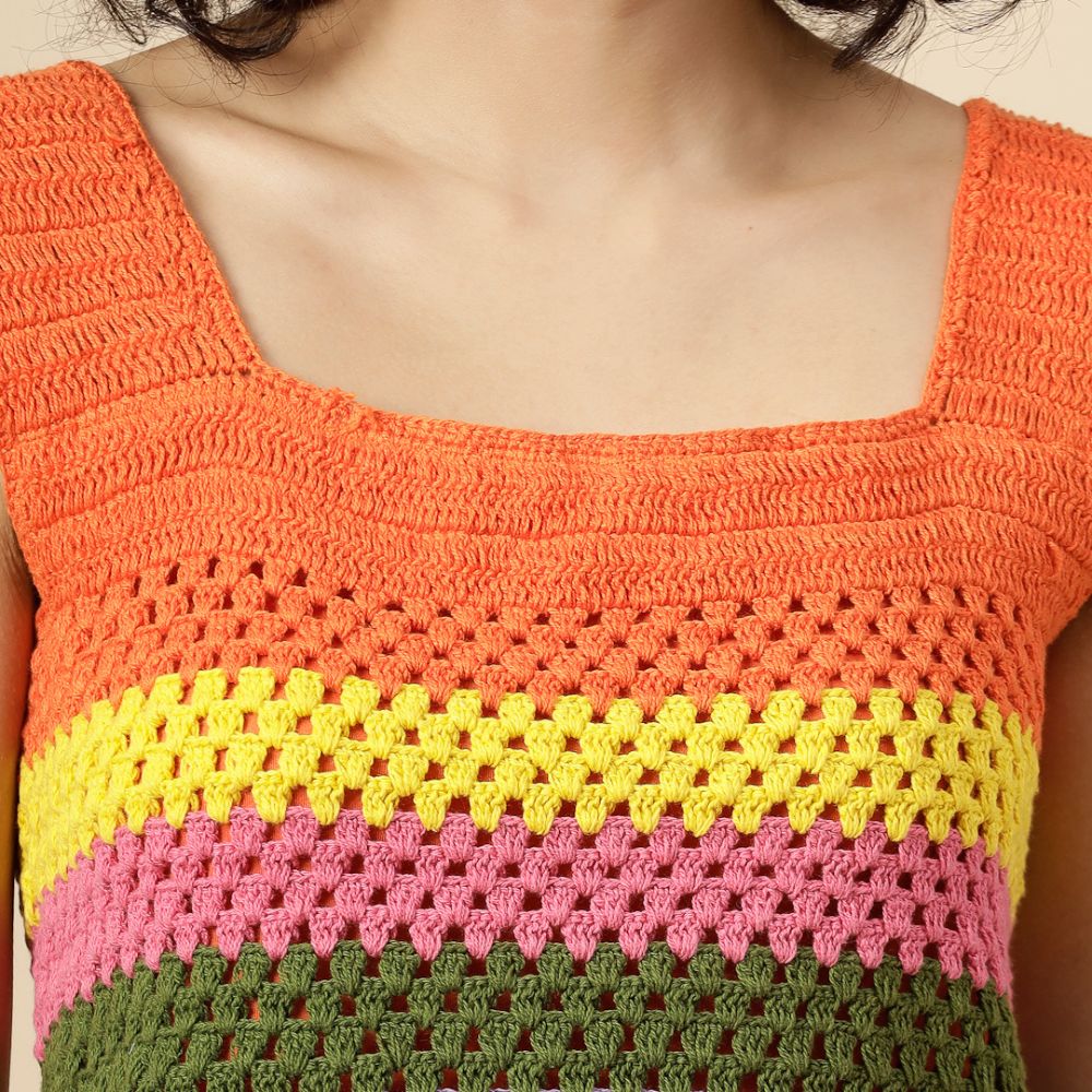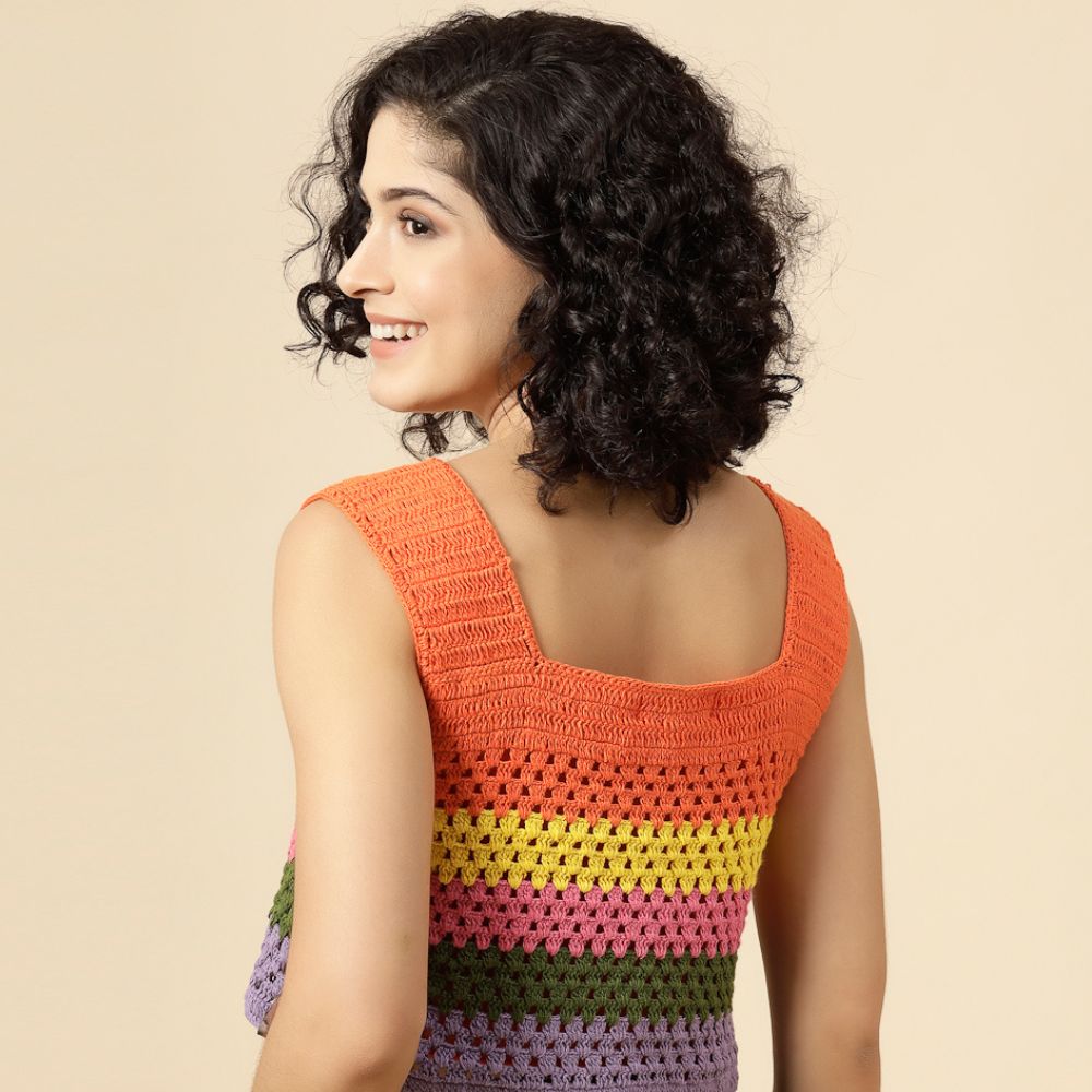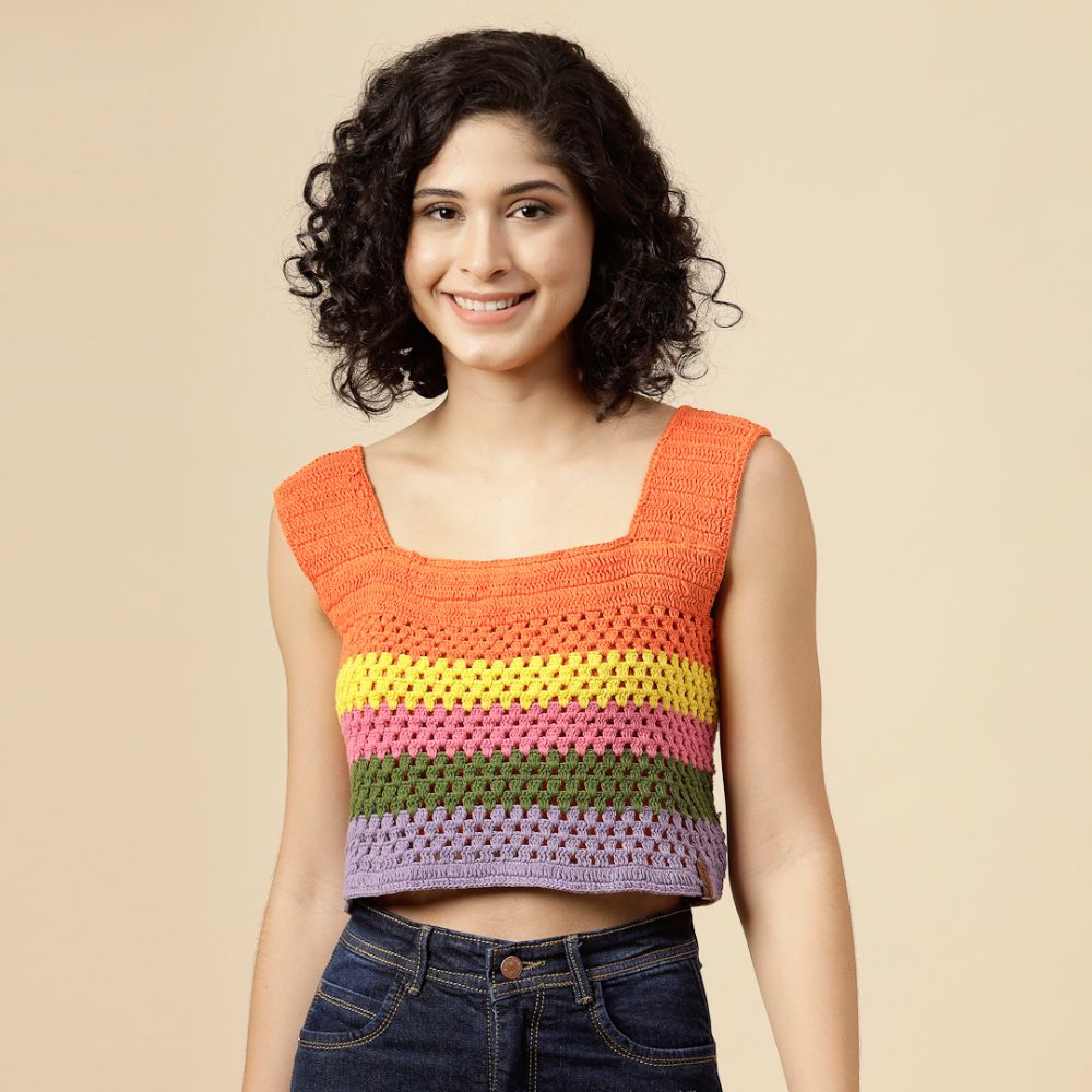 Turn up the color and confidence with this cheerful Velvery Crochet Multicolor Crop Top. Hand-knitted to perfection, this sleeveless top features bold horizontal stripes in vibrant shades of orange, yellow, pink, green, and lavender — a rainbow-inspired palette that’s sure to lift your mood and your style.