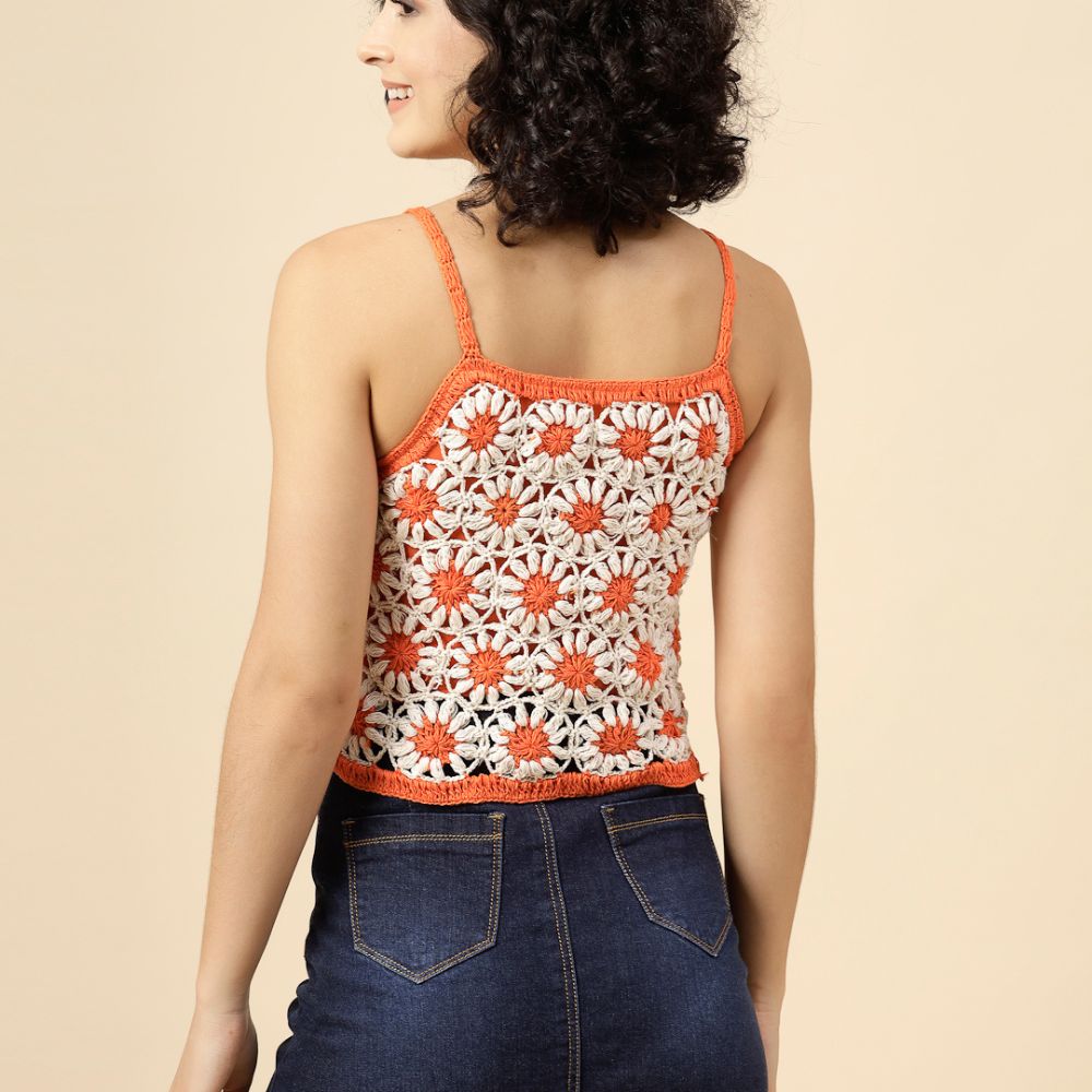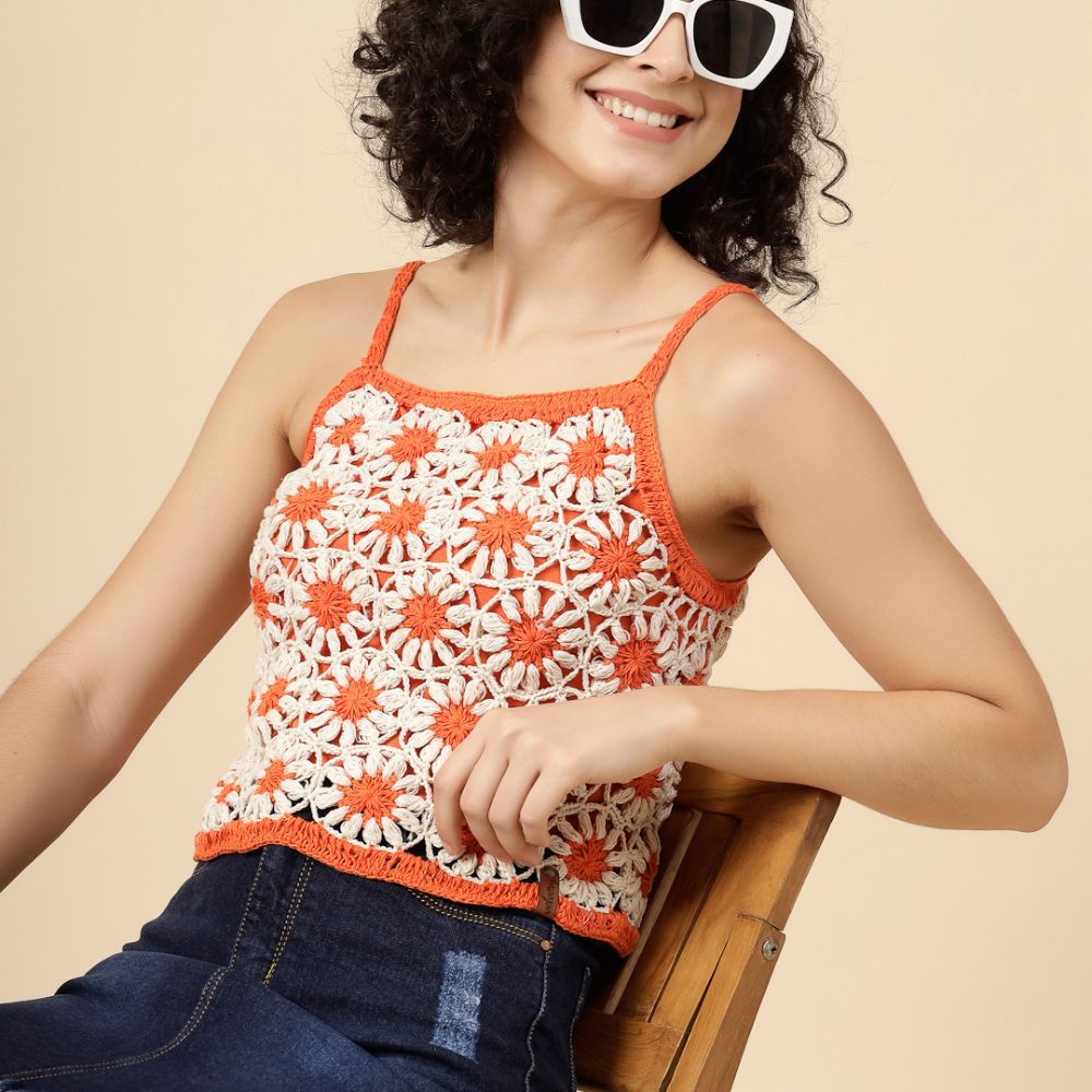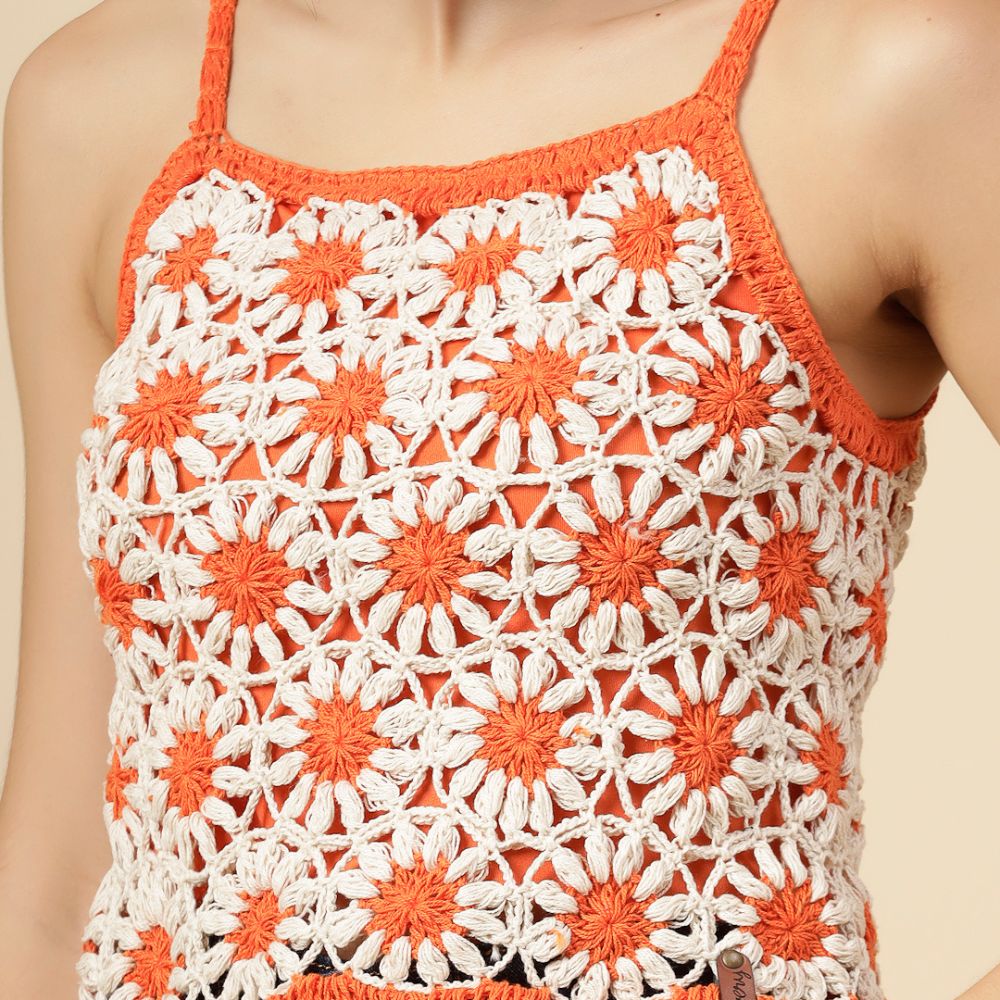 Velvery Crochet Orange Floral Sleeveless Hand Knitted Crop Top