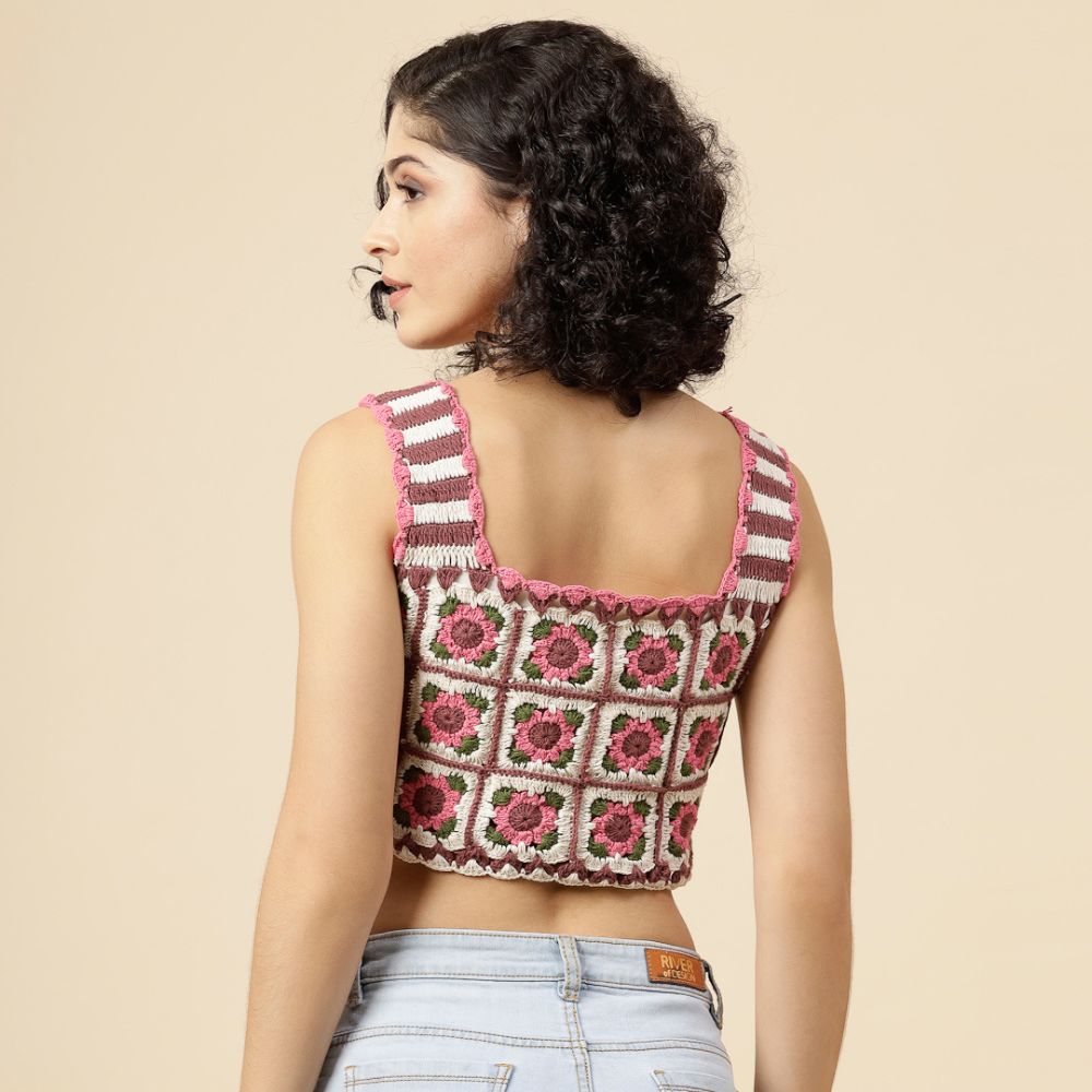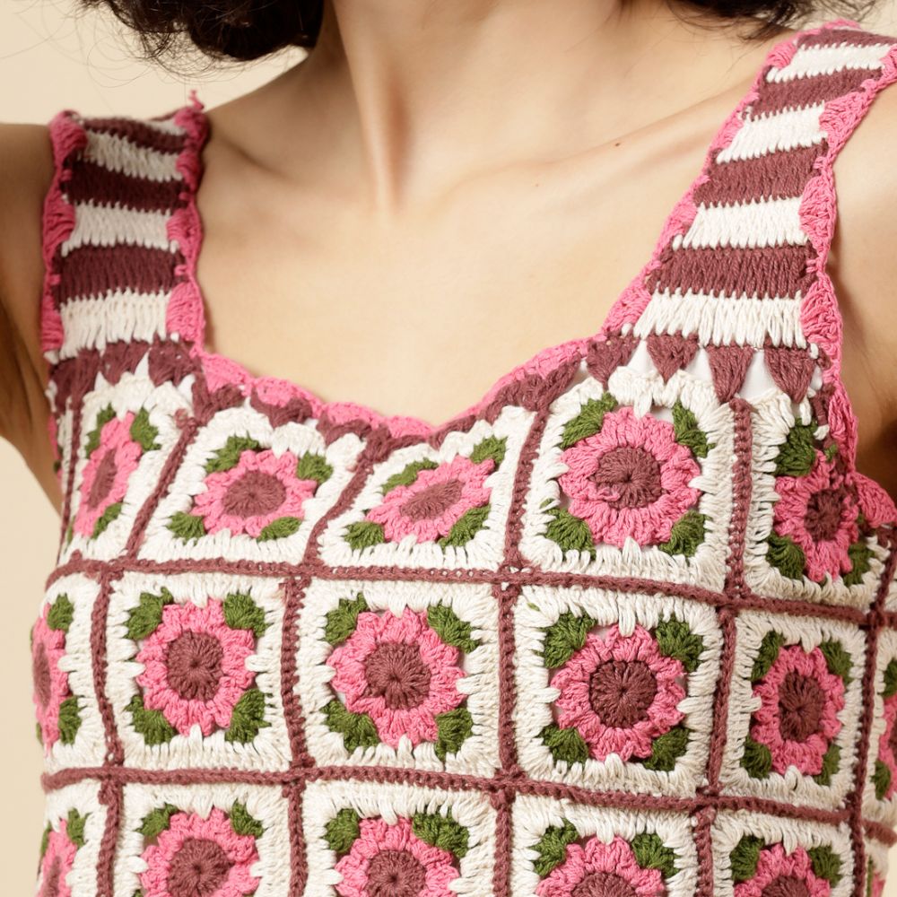 Sweet, stylish, and blooming with charm — the Velvery Pink Floral Crochet Crop Top is a must-have for your summer wardrobe. Hand-knitted with love, this top features delicate floral motifs in shades of pink, white, brown, and green that give off a fresh, garden-inspired vibe.