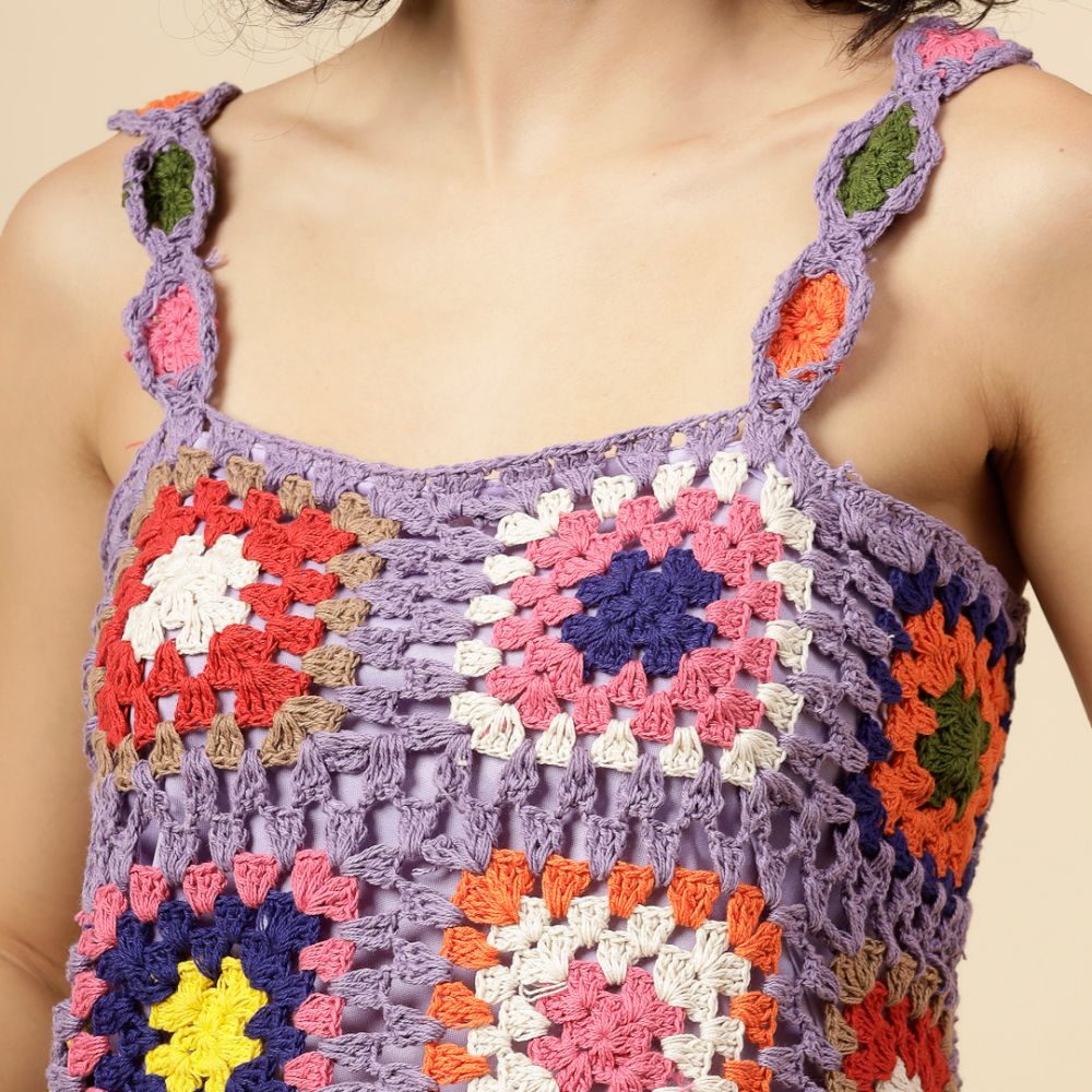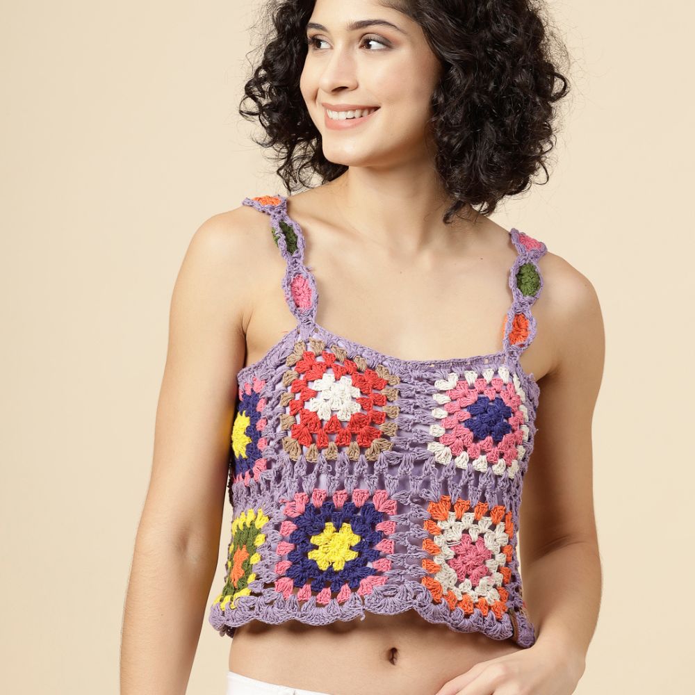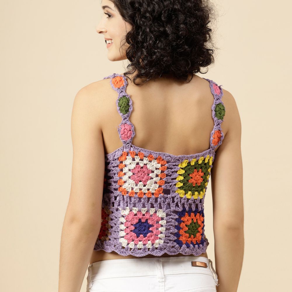 Step into a vibrant, boho-chic vibe with the Velvery Crochet Purple Crop Top — a stunning handcrafted piece that celebrates playful color and artisanal flair. This sleeveless crop top is hand-knitted with multicolored yarn blocks in a traditional granny-square crochet pattern, all stitched together over a soft purple base for a striking yet harmonious look.