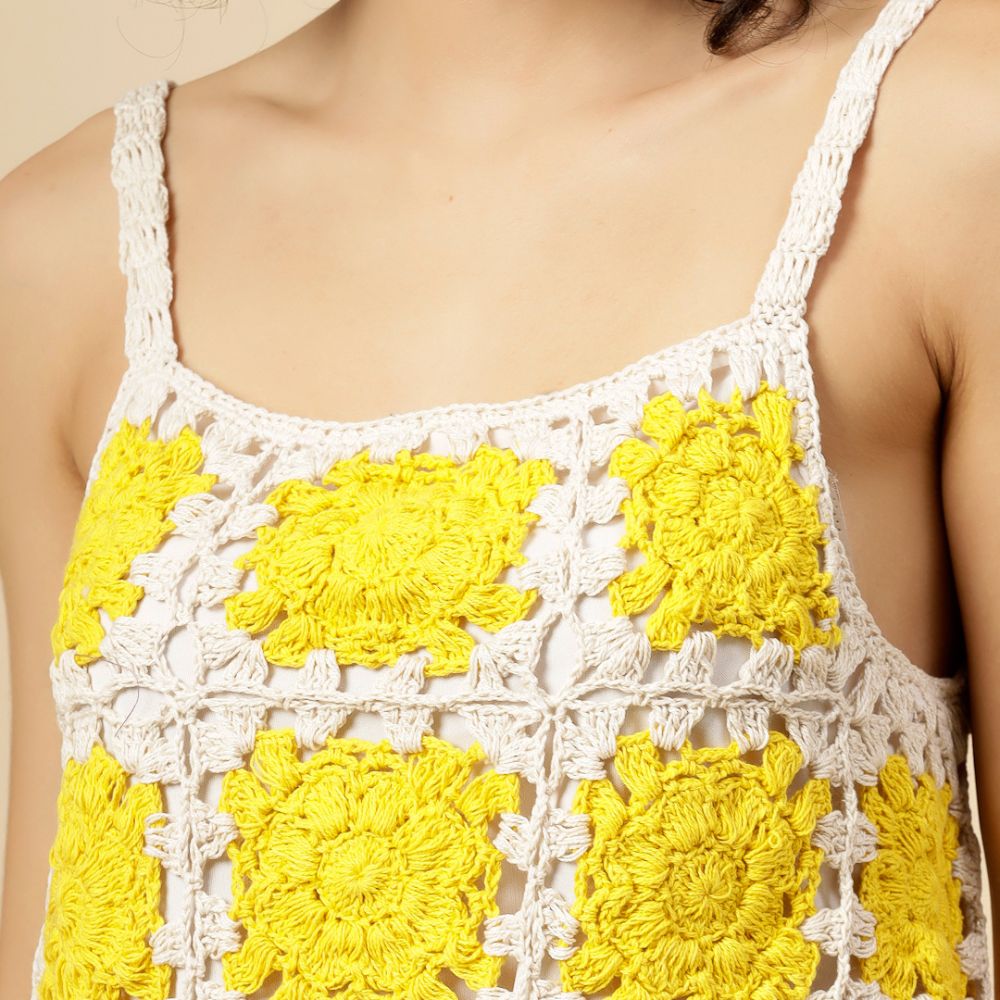 Brighten up your wardrobe with the sun-kissed charm of the Velvery Yellow Crochet Crop Top. This sleeveless, hand-knitted beauty features a delicate self-design crochet pattern, crafted with care using soft and breathable yarn. The vibrant yellow hue exudes warmth and positivity, making it the perfect pick for sunny days and cheerful moods.