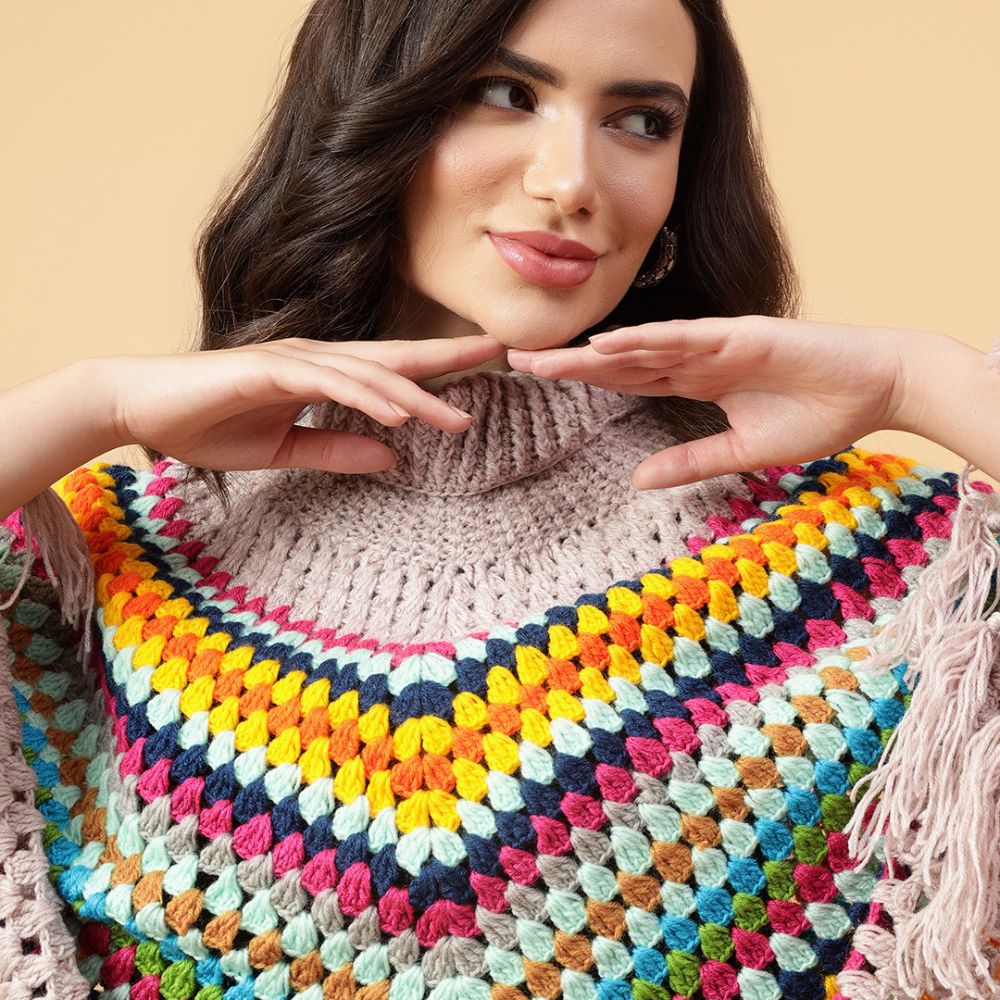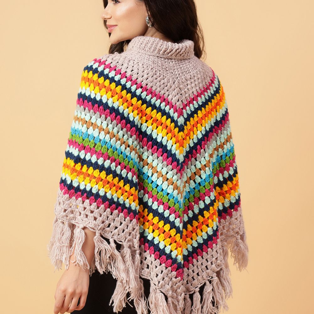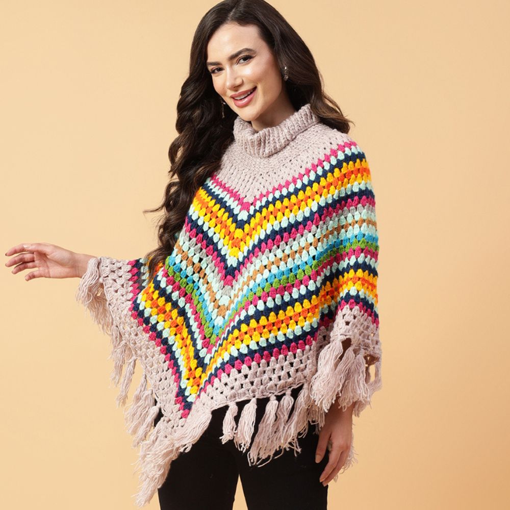 • Tassel Detailing: Playful tassels at the hem add a fun and dynamic touch to the classic poncho style.