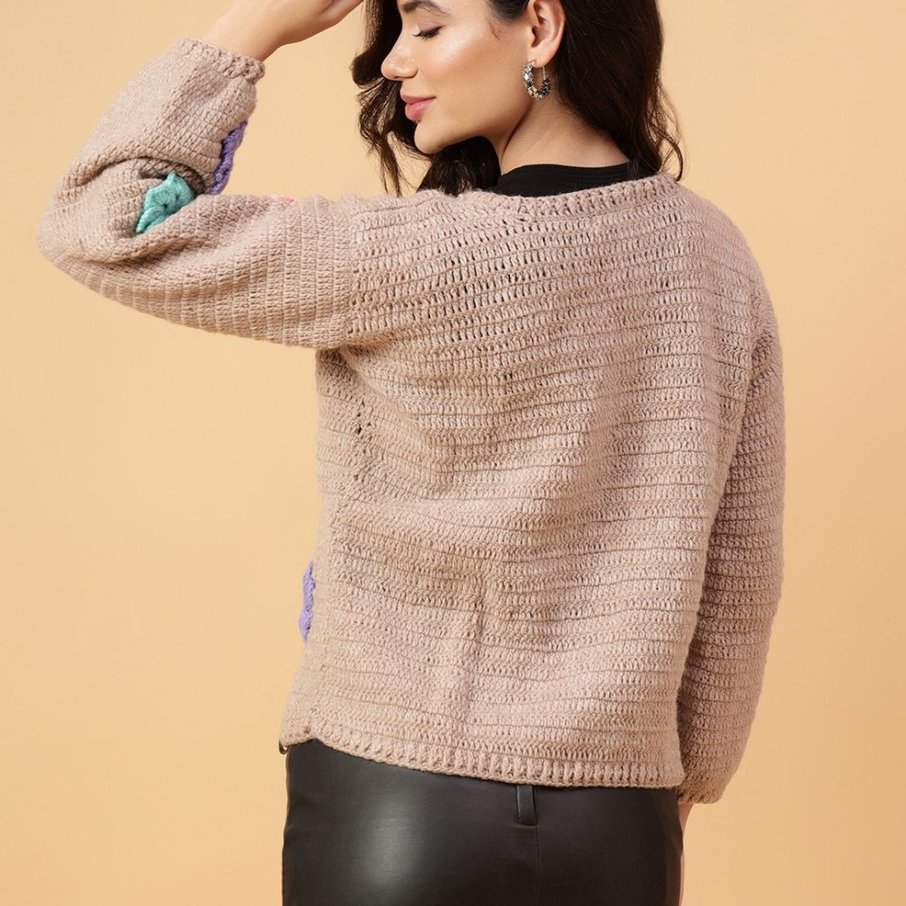 • Design: Beige with intricate crochet details, round neck, and long sleeves.