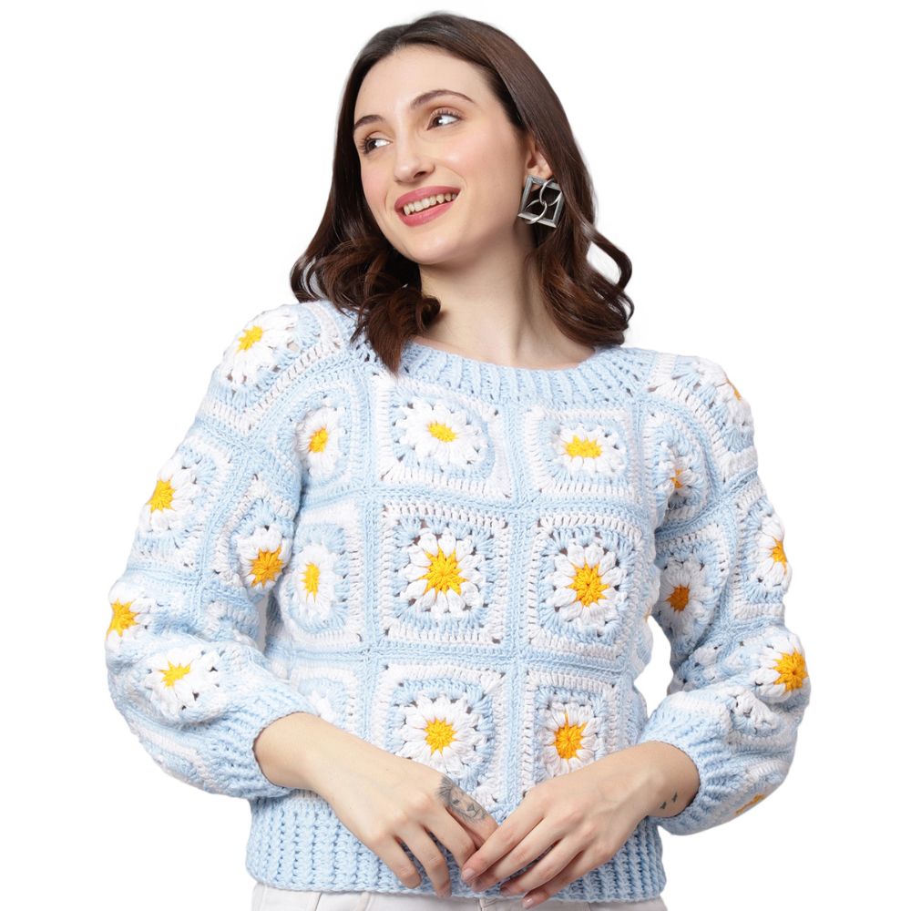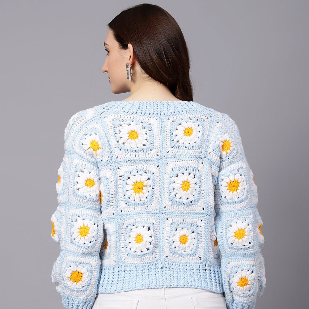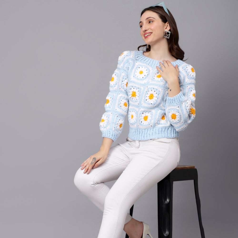 Celebrate the beauty of daisies with the Velvery Handmade Blue & White Daisy V-Neck Pullover. A perfect combination of cozy and chic, this pullover is sure to become a wardrobe favorite. Order yours today!