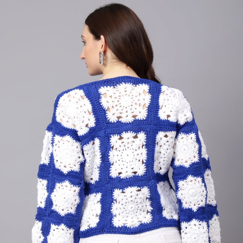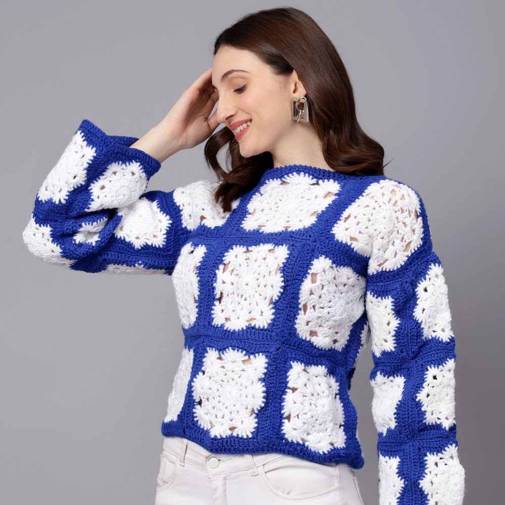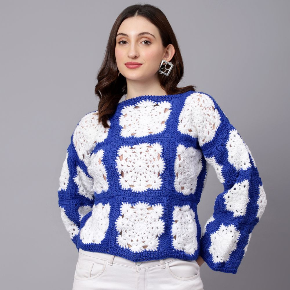 Velvery Handmade Blue & White Crochet Snowflake Pullover