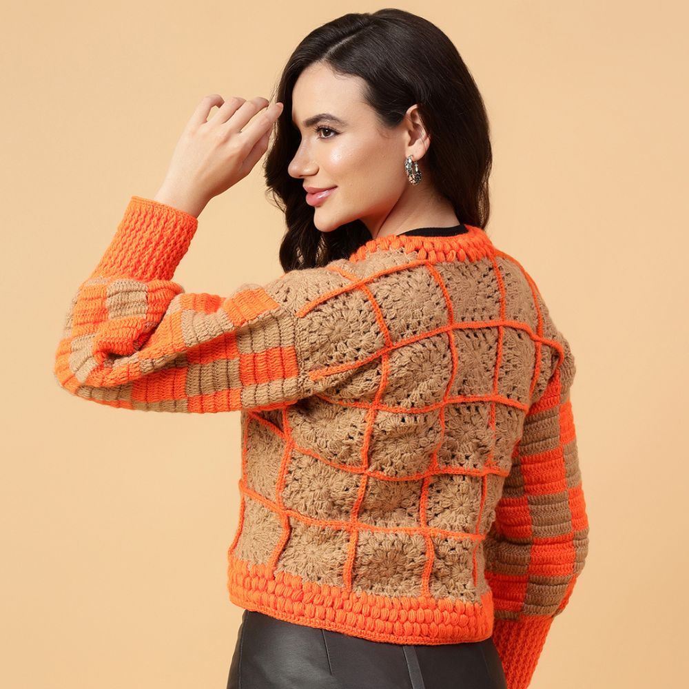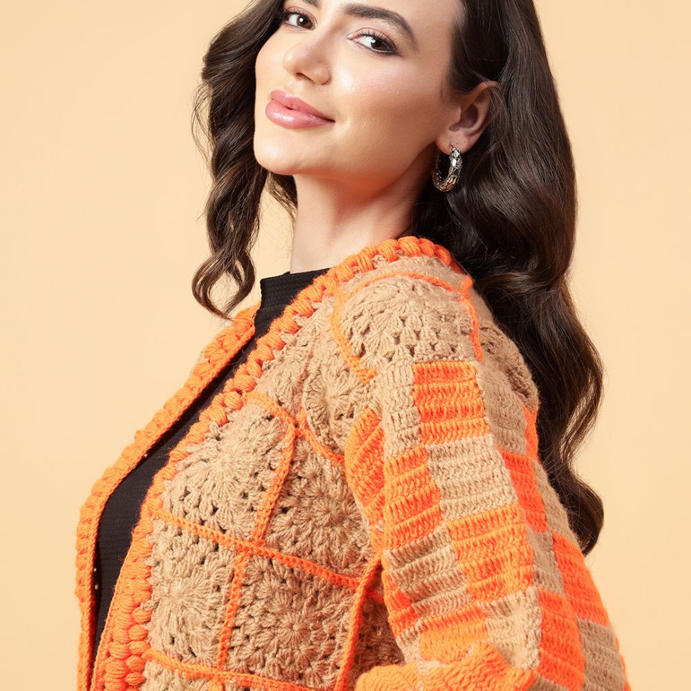 Elevate your winter wardrobe with this exquisite Velvery Handmade Brown & Orange Crochet Cardigan. Featuring a classic V-neck design, this cardigan is meticulously handcrafted with a blend of rich brown and vibrant orange hues in a striking checkered pattern. Perfect for casual outings or cozy gatherings, this piece combines timeless elegance with contemporary style. Its lightweight yet warm texture ensures all-day comfort while keeping you effortlessly chic.