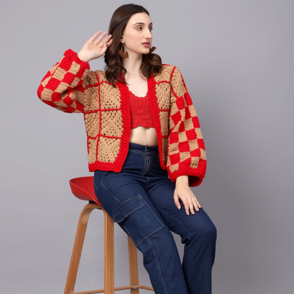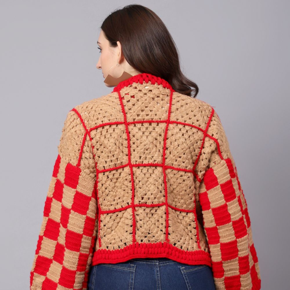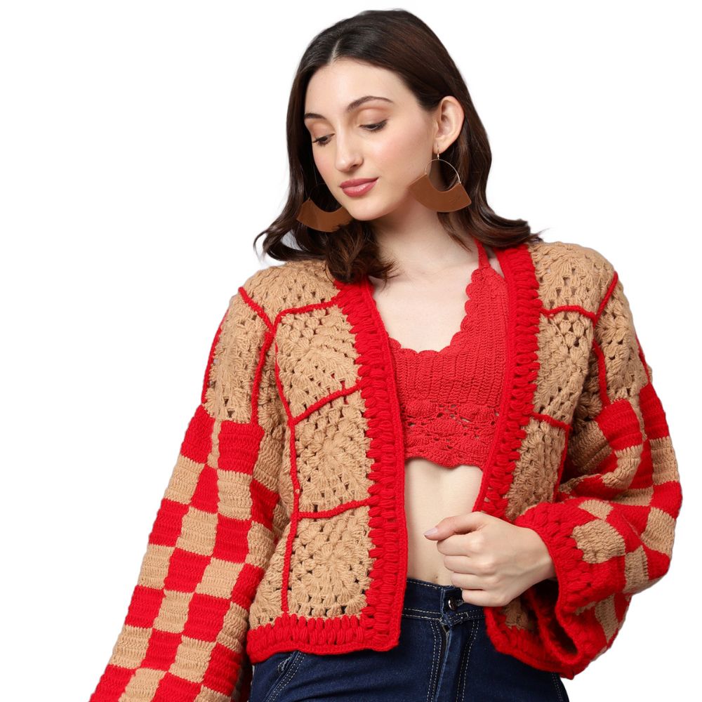 Velvery Handmade Brown and Red Crochet  V-Neck Cardigan