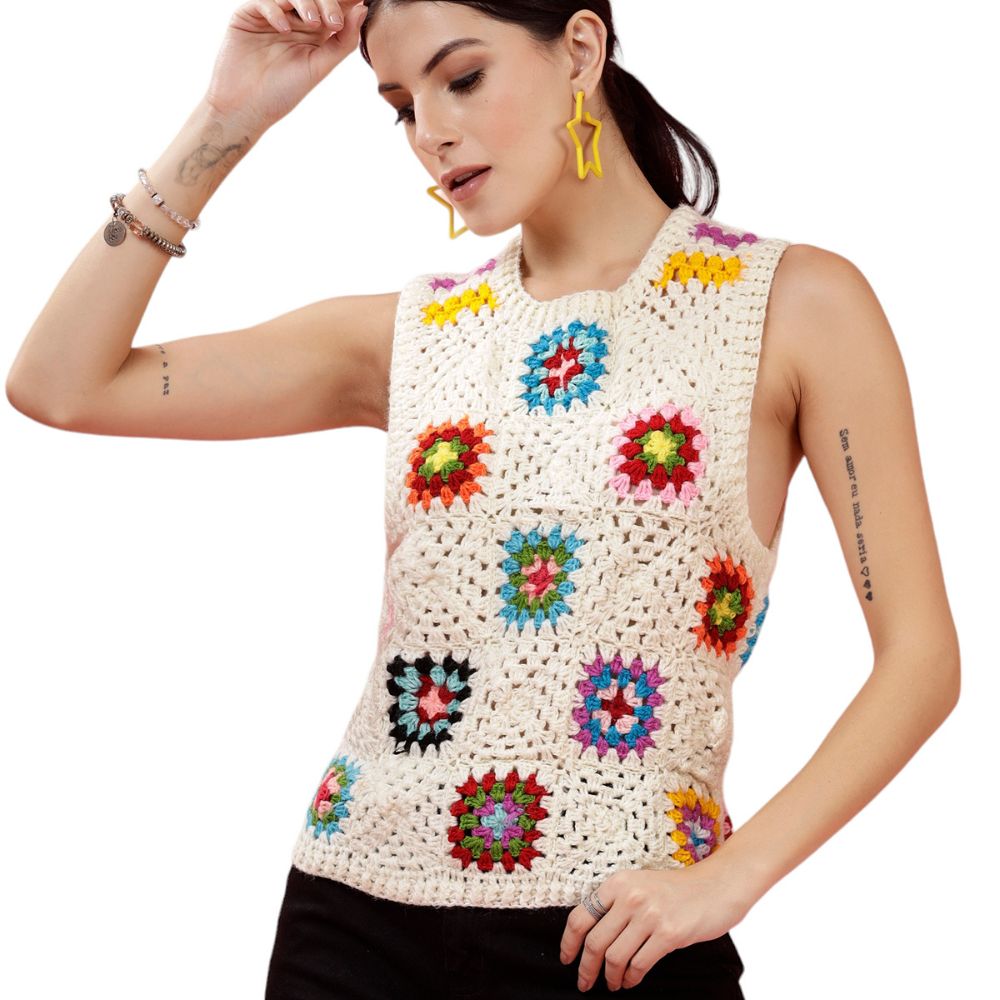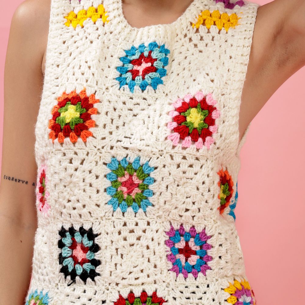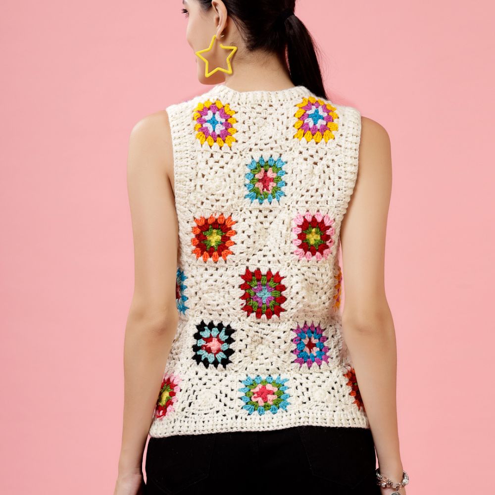 Velvery Handmade Cream and Multi Granny Square Round Neck Sweater Vest