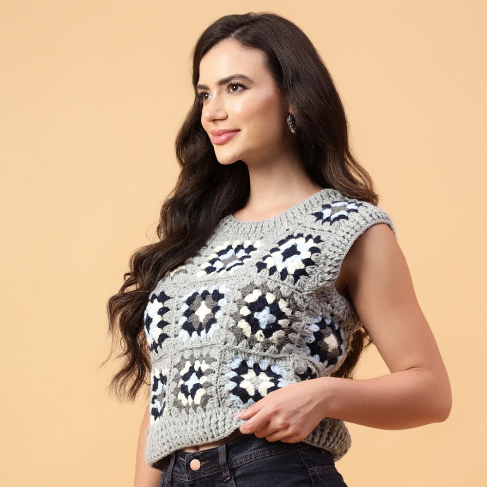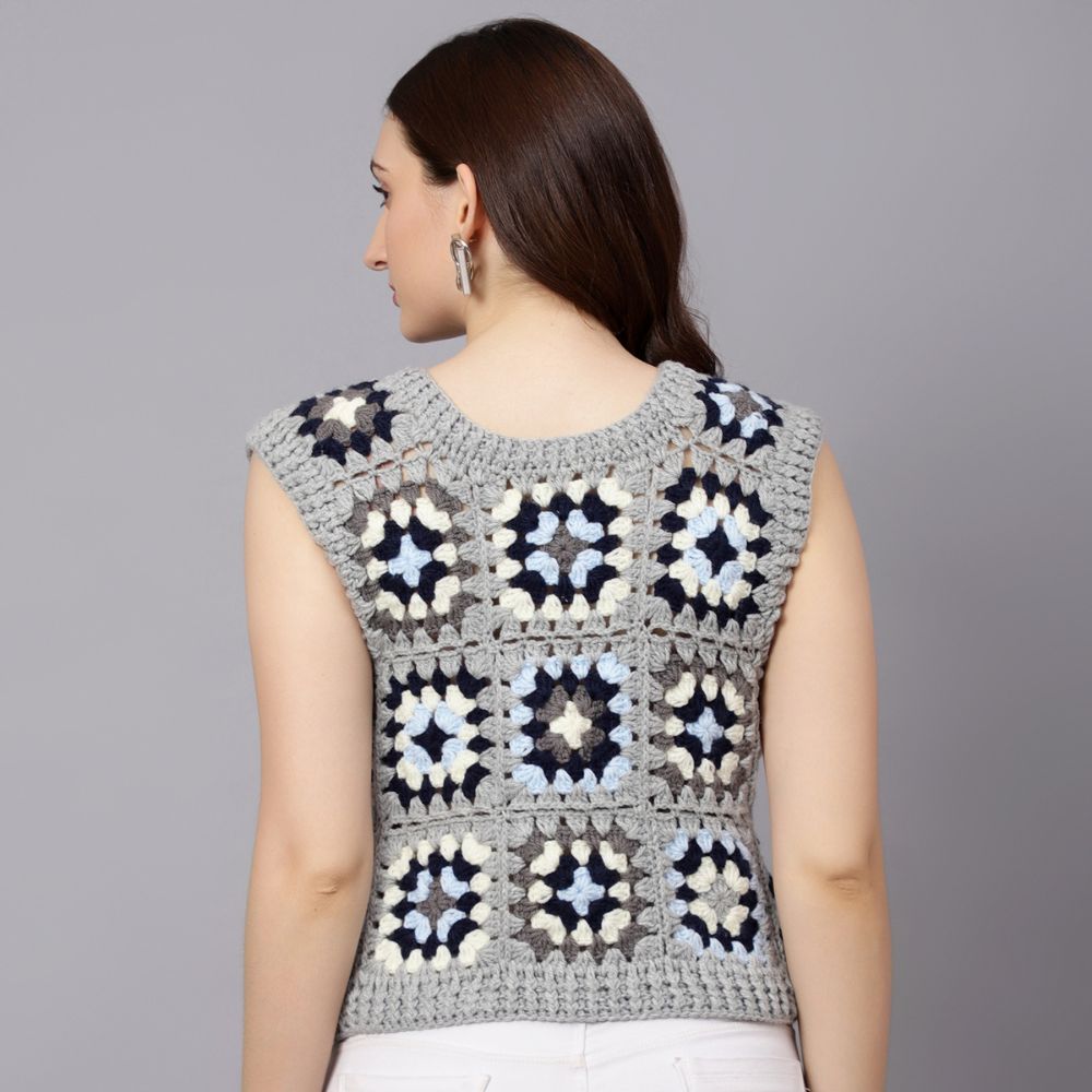 Velvery Handmade Grey Granny Square Round Neck Sweater Vest