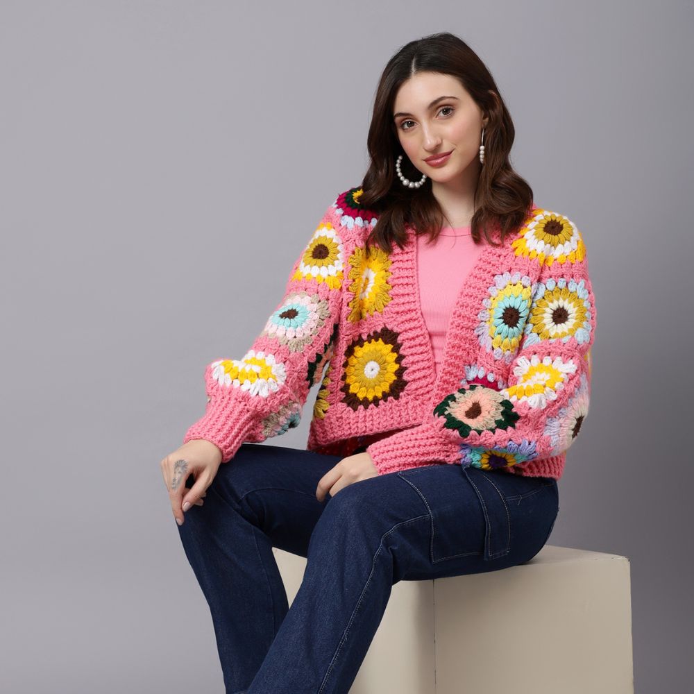 Step up your style game with the Velvery Handmade Pink & Multi Puffy Sleeve V-Neck Cardigan, a masterpiece of handcrafted artistry. Featuring a vibrant pink base adorned with colorful accents, this cardigan is designed with dramatic puffy sleeves and a flattering V-neckline that adds elegance to any outfit. Perfect for casual outings or a stylish evening layer, this cardigan brings comfort and uniqueness to your wardrobe.