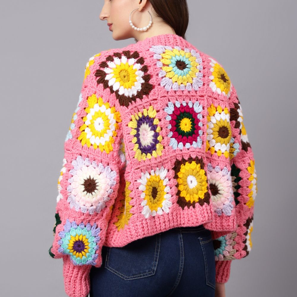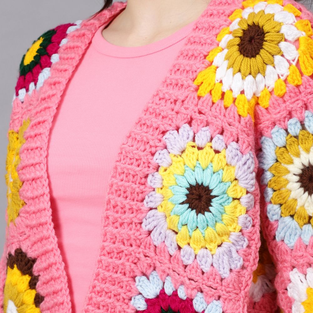 Velvery Handmade Pink and Multi Puffy Sleeve V-Neck Cardigan