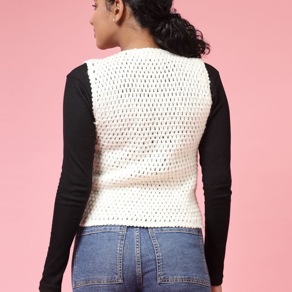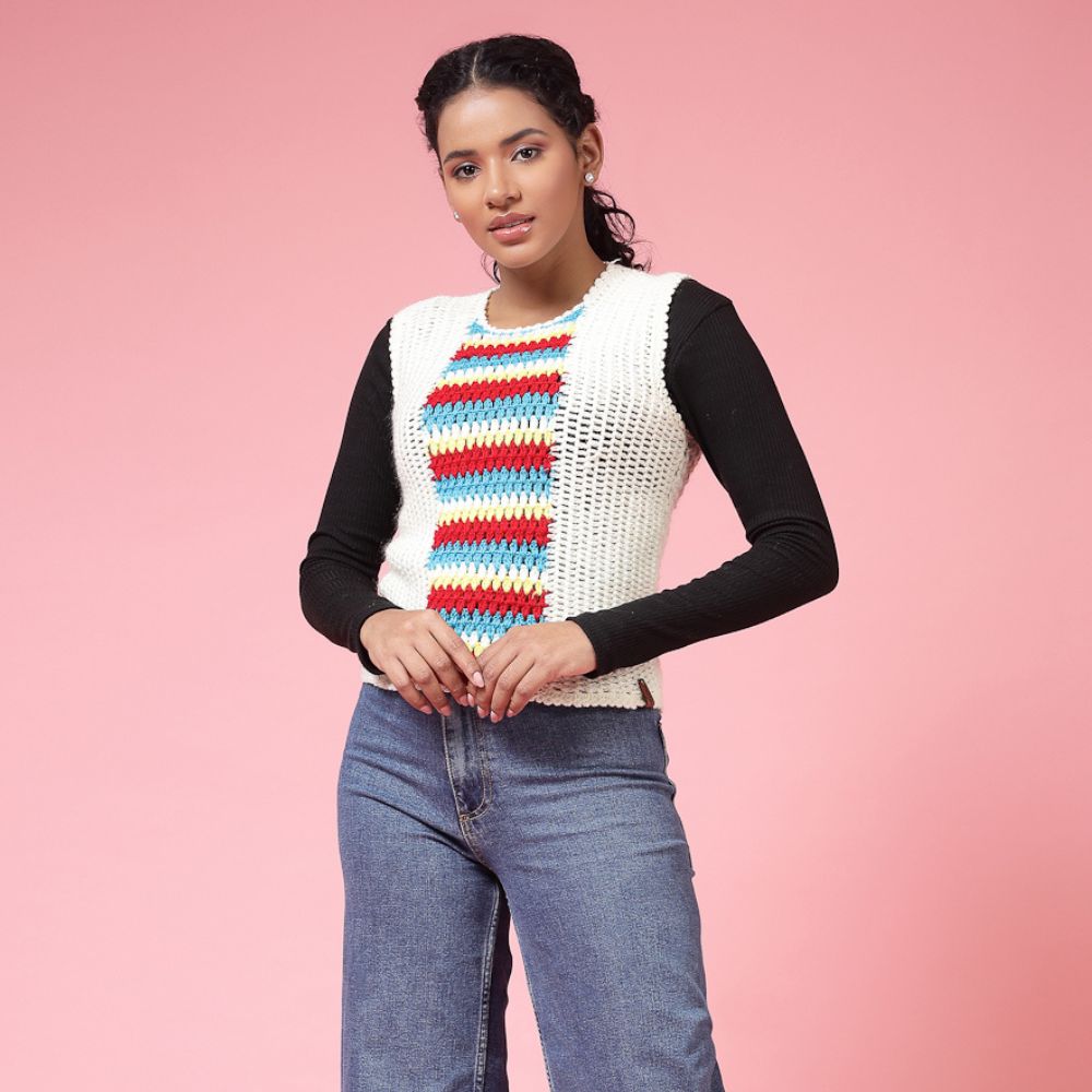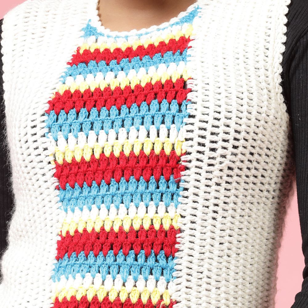 Velvery Handmade White and Multi Handmade Crochet  Round Neck Sweater Vest