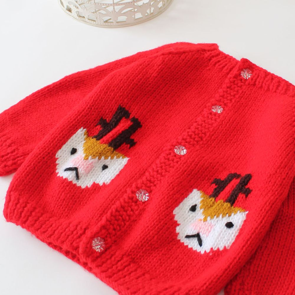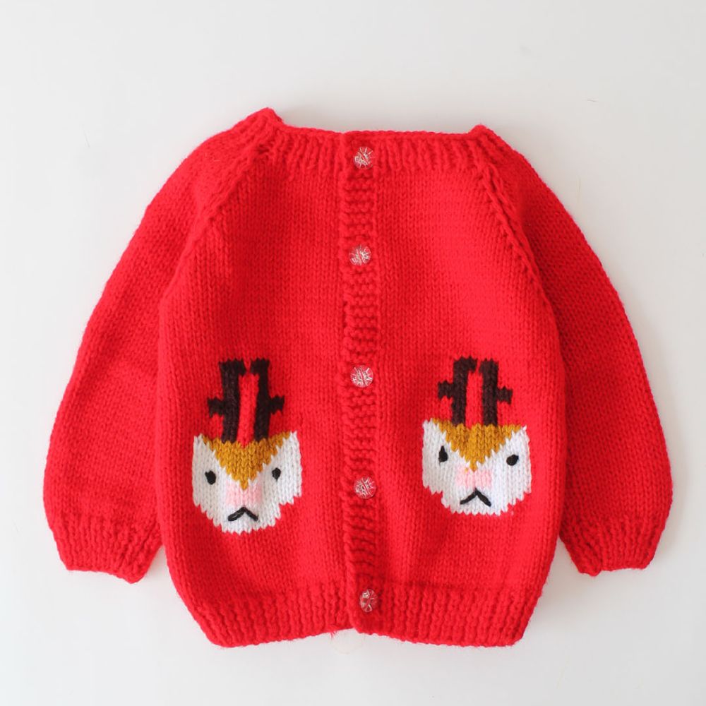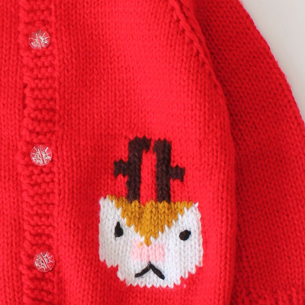 Pattern: The front of the sweater showcases an adorable pattern: two cartoon-like chicken faces with orange beaks and top hats. These whimsical chickens are knitted into the fabric on either side of the button closure.
