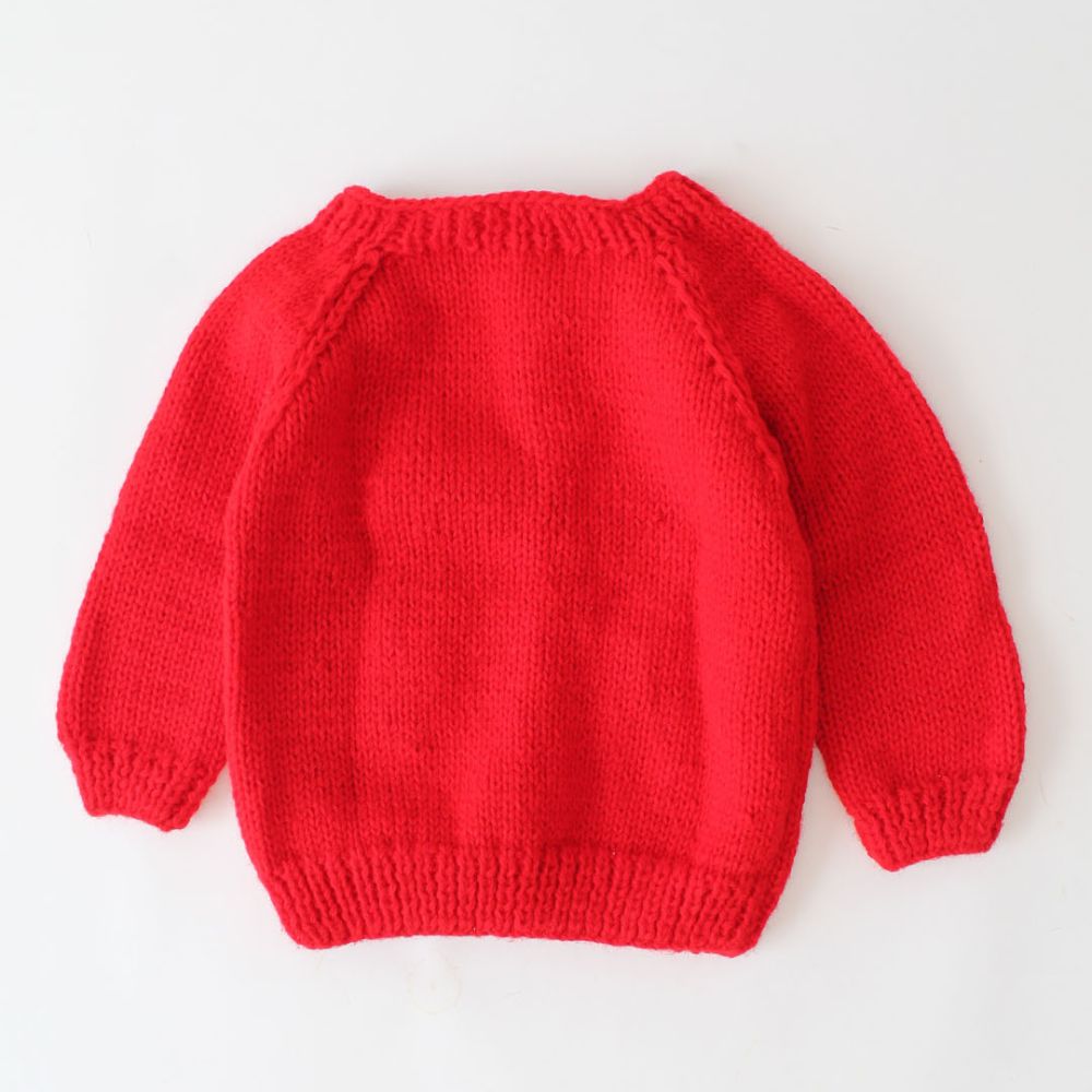 The sweater appears to be made from a soft, fine knit, likely wool or a wool blend. Its smooth texture and slight sheen suggest quality and comfort.Designed for a small child, this sweater features long sleeves and a classic round neck style. The simplicity of the design ensures ease of wear and movement.Overall, this little red sweater combines comfort, playfulness, and style—a perfect addition to a child’s wardrobe.