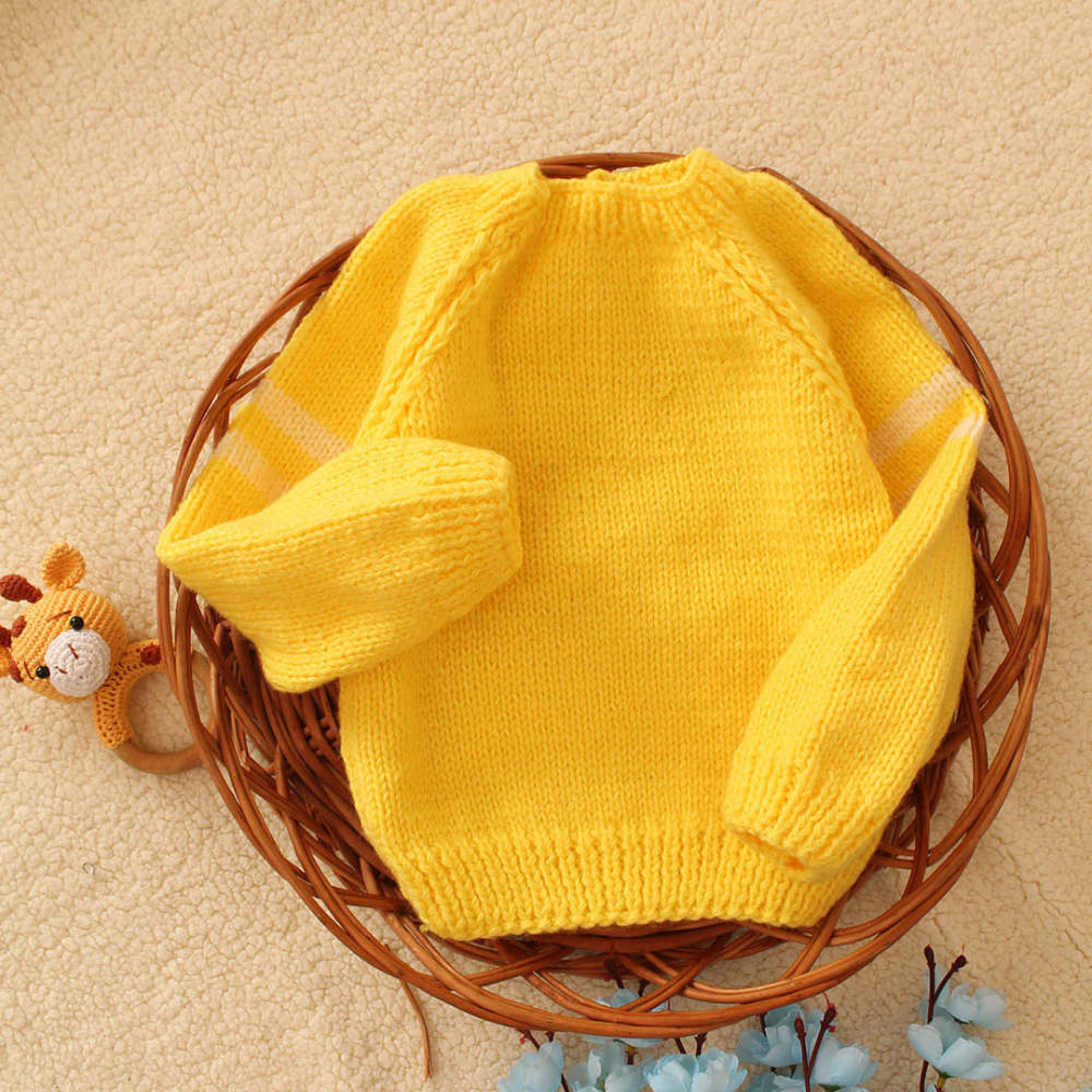 The knit appears to be ribbed, adding some interesting texture. Each sleeve features two horizontal white stripes near the cuffs, creating a stylish contrast. This cozy sweater would be perfect for chilly days.                                                                                        Color: The sweater is a vibrant yellow throughout its main body.