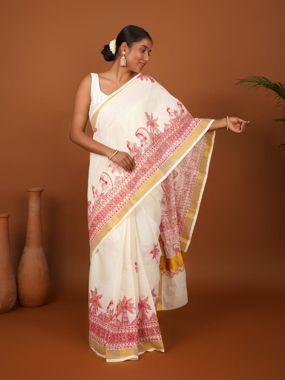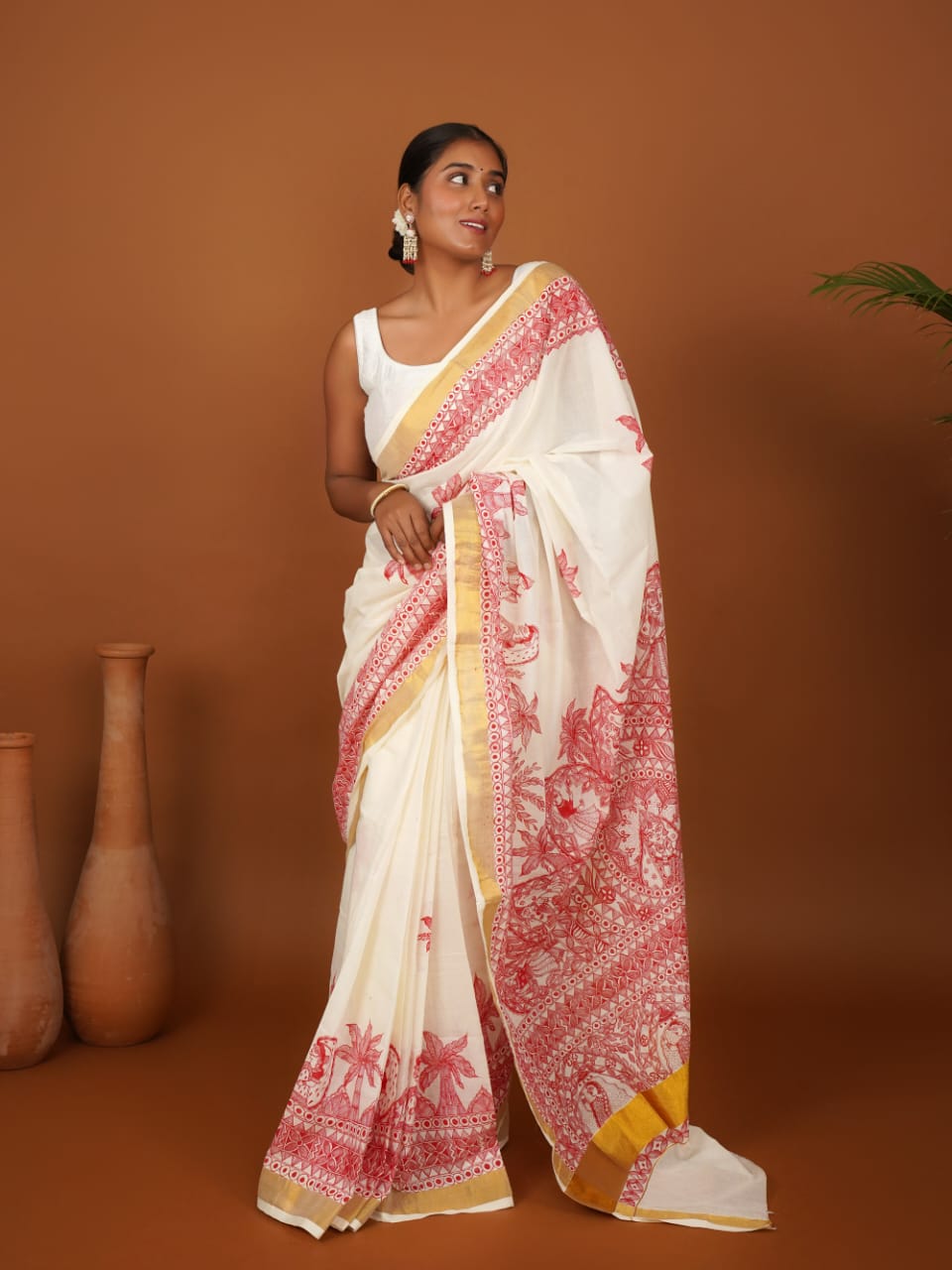 Vivaah Vriksha Saree – Off White Cotton with Golden Zari Border & Handpainted Madhubani Aanchal
