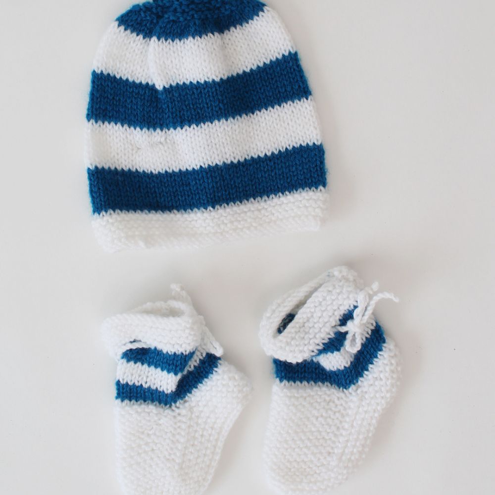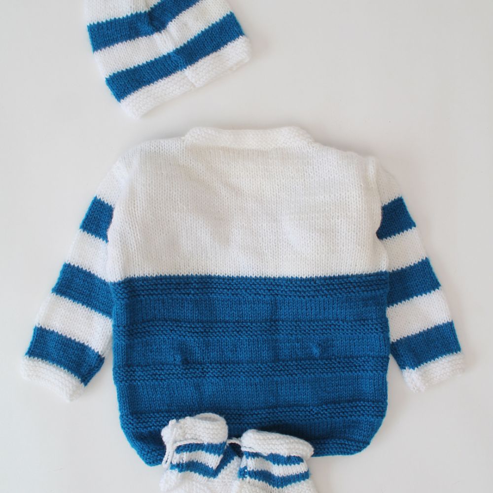 Design: The sweater is a charming hand-knit piece, perfect for little ones. It features a classic design with long sleeves and a round neck.Additionally, two white pom-poms serve as decorative embellishments on the front.The matching hat and booties maintain consistency with the same stripe pattern, colors, and ribbed details. The hat has a snug ribbed brim and another white pom-pom on top. As for the booties, they feature ribbed cuffs to keep those tiny feet cozy.Overall, this set exudes handmade charm and warmth, making it an ideal choice for little ones during colder seasons.