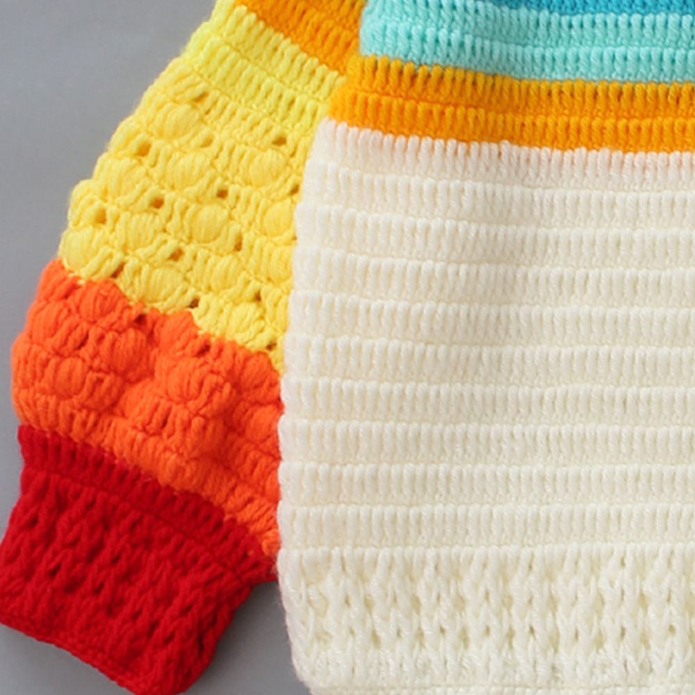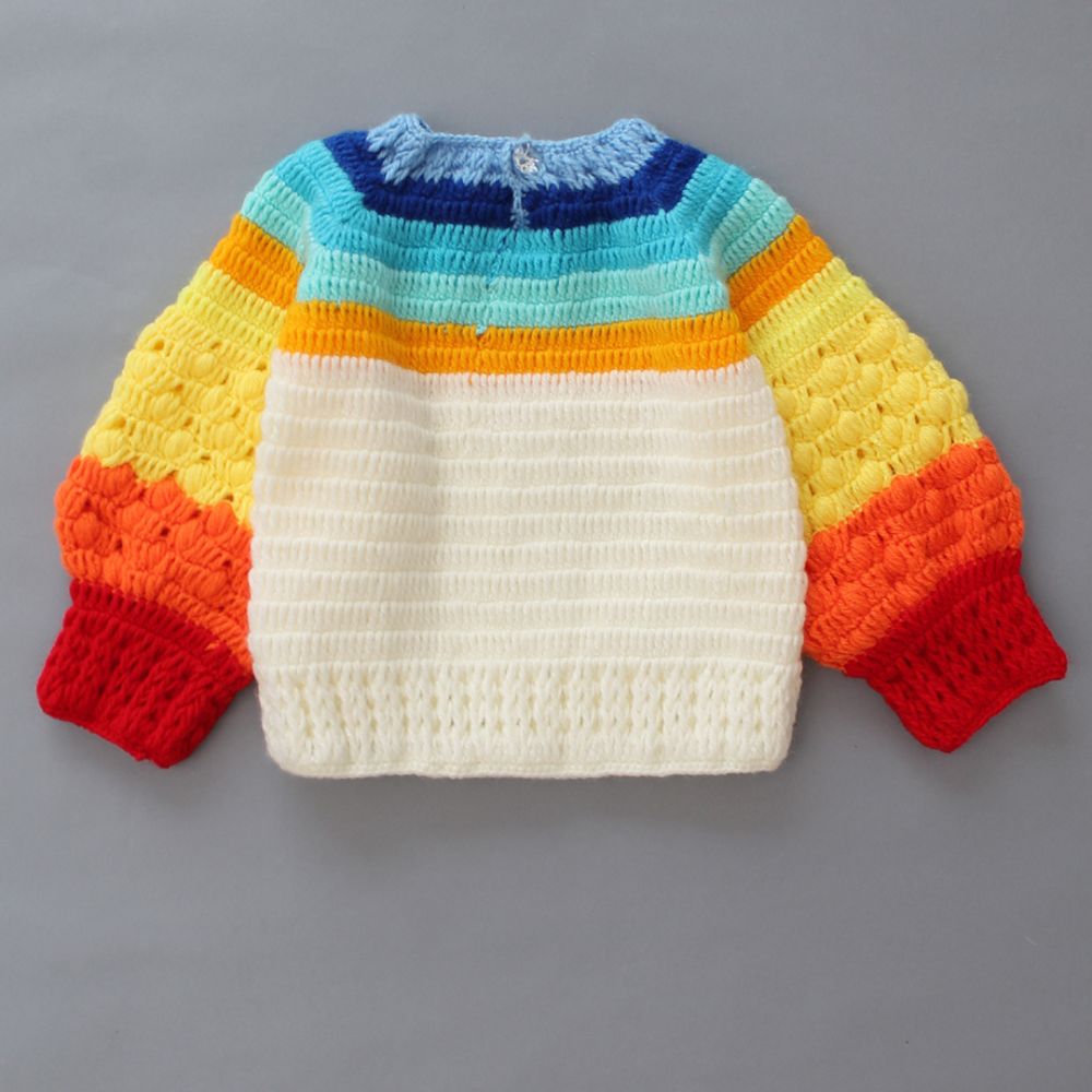 Design: The sweater features a vibrant and colorful design. Its long sleeves showcase distinct color blocks: starting from the cuffs, there’s bright red, followed by orange, yellow, light green, and ending with blue at the collar. The body of the sweater is primarily white, allowing the sleeve colors to stand out. Colour: This vibrant sweater flaunts a delightful mix of colors like orange, blue, red, white, orange.