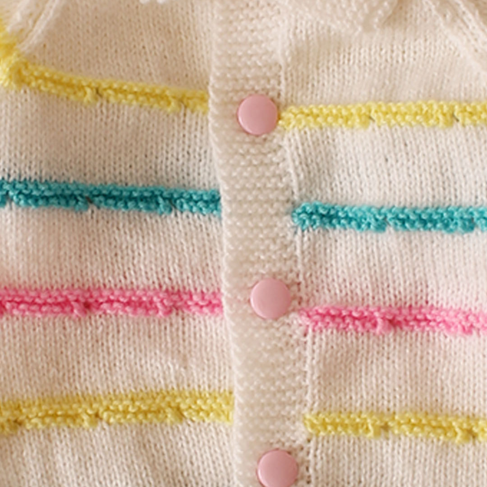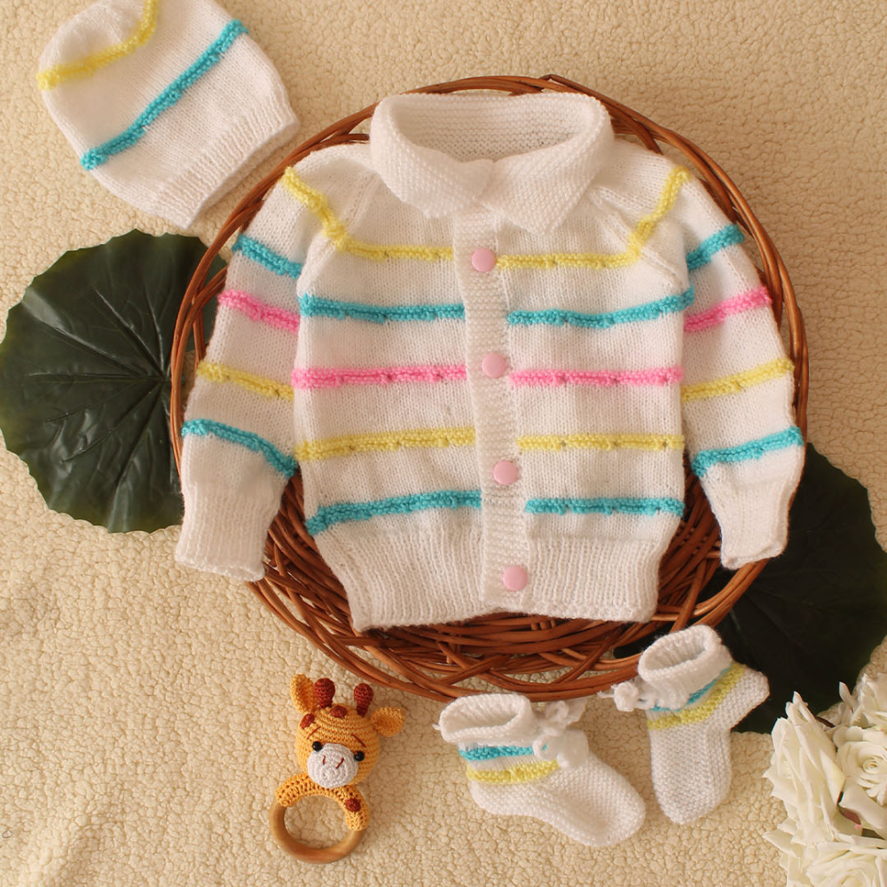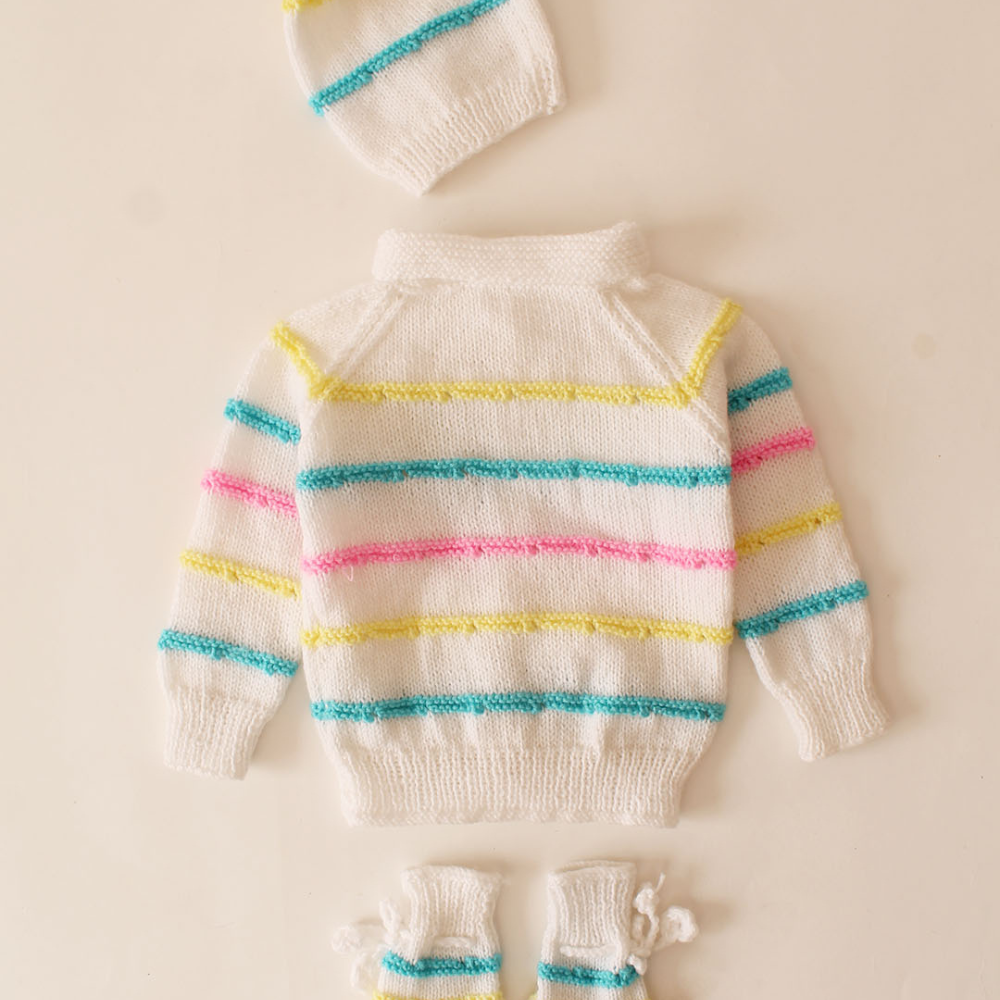 The sweater is knitted and predominantly white and a set that includes a matching hat and booties. It features horizontal stripes in pastel colors: yellow, blue, pink, and green. This sweet ensemble is perfect for keeping a baby warm and stylish.                          Color: White                                                                                                                                                                                            Neck: The sweater has a collar neck, which adds a touch of classic style.