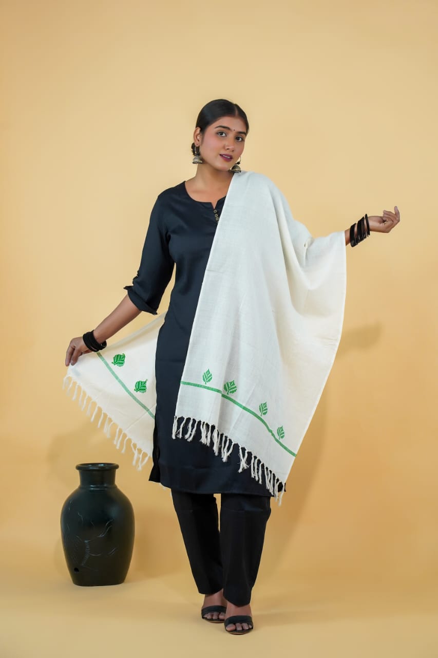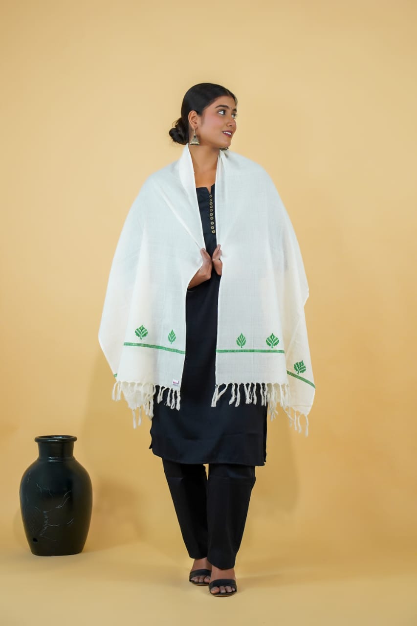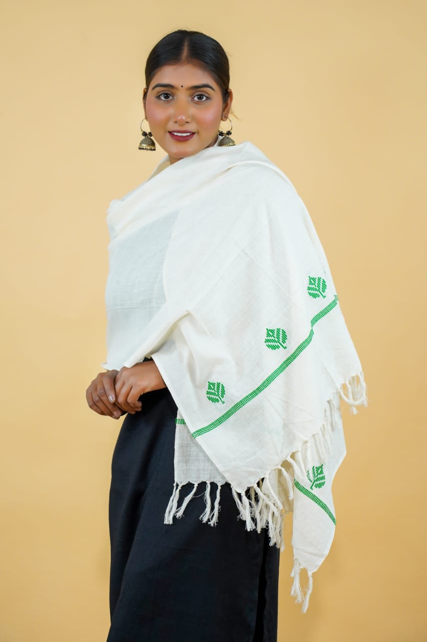 Wrap yourself in tradition with this timeless White Handloom Cotton Stole, intricately woven using Bawan Buti, one of the oldest and most treasured weaving art forms from Bihar. Accented with a cheerful yellow border and delicate buti motifs, this piece carries the elegance of simplicity and the richness of cultural heritage.