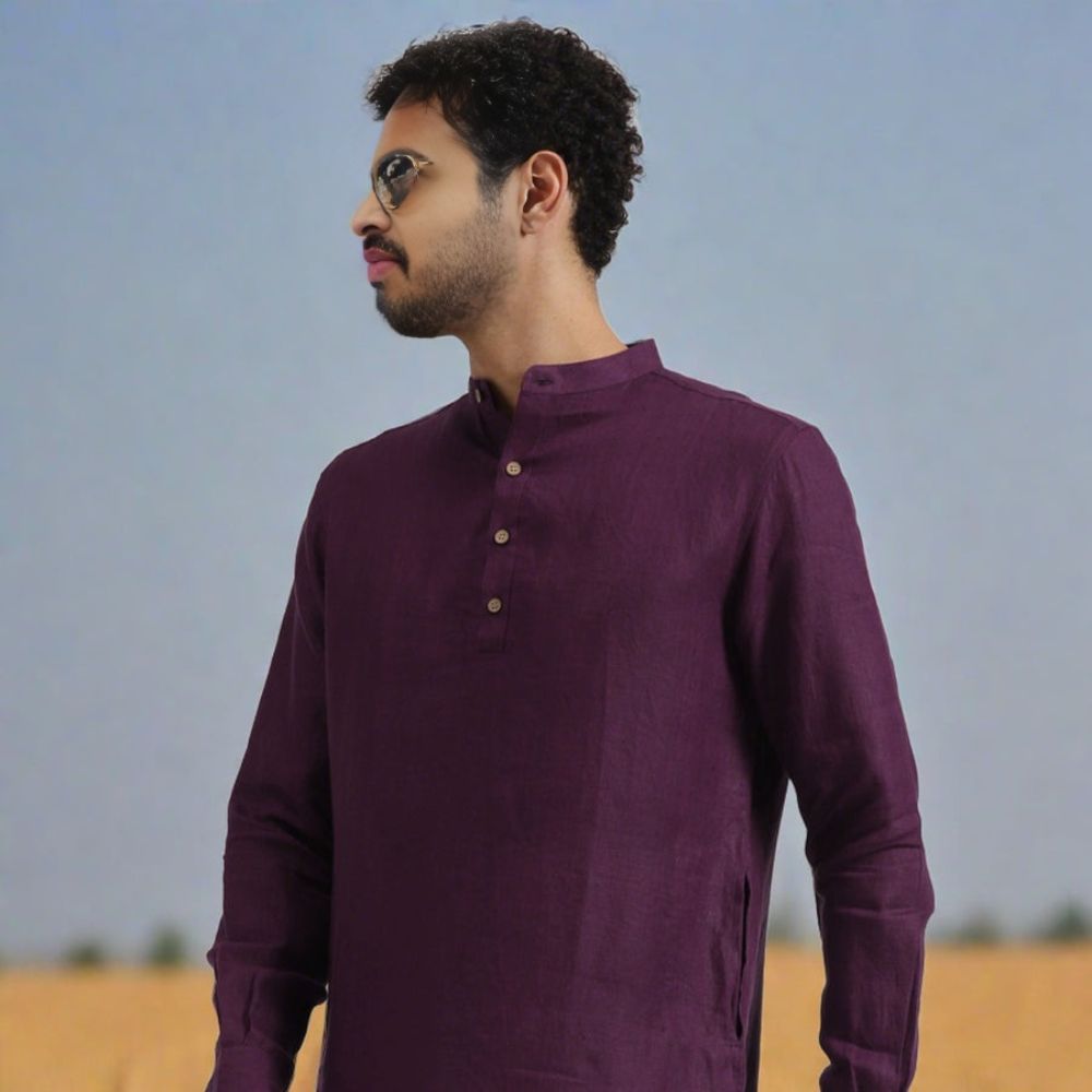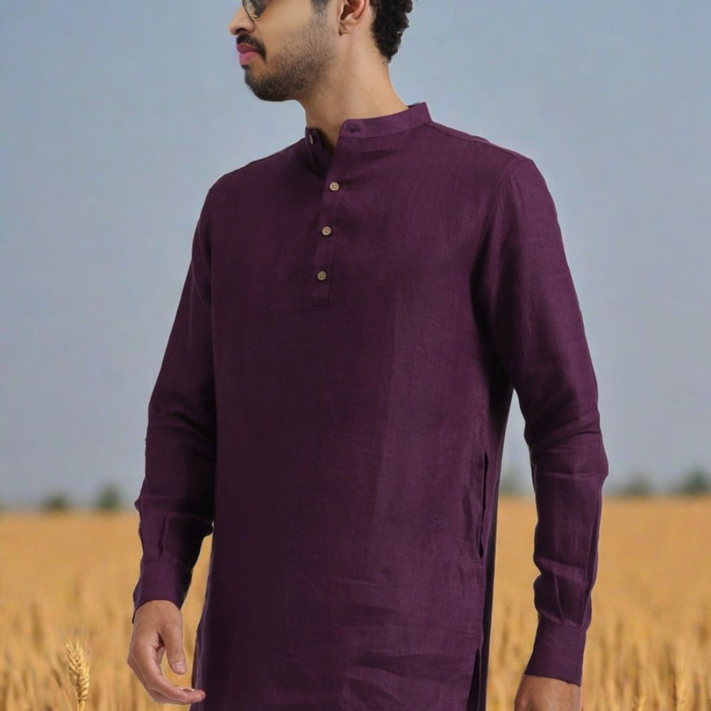 This wine-colored linen kurta. It’s crafted from 100% pure linen, making it lightweight, breathable, and ideal for any season. The mandarin collar and half-button placket bring a sharp, minimal look, perfect for both casual outings and festive occasions.
