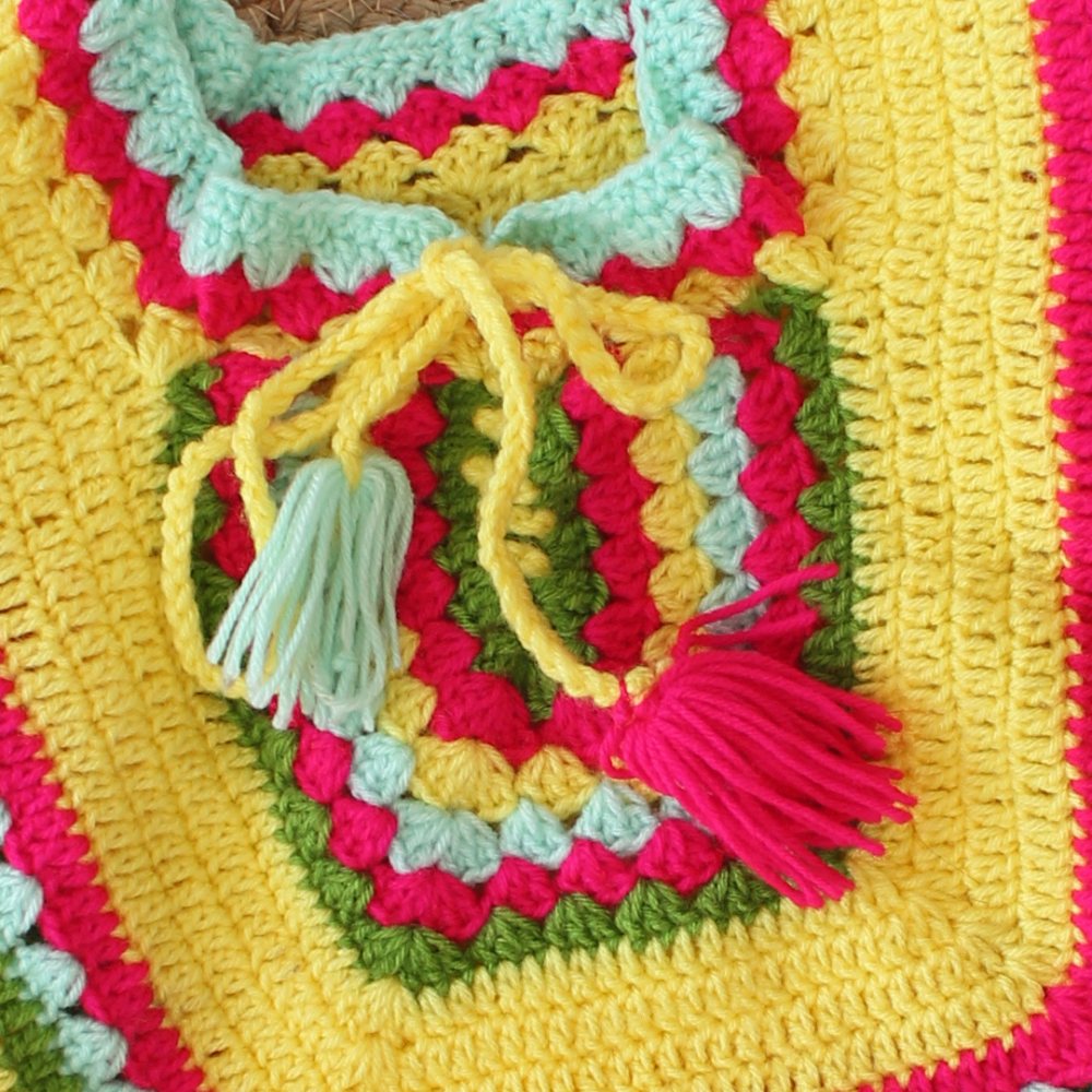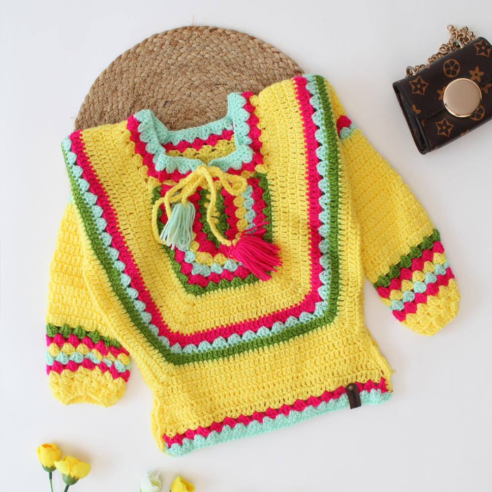 Neck: The neck is styled as a V-neck, adding a touch of elegance. But wait, there’s more! At the center of the V-neck, you’ll find a charming embellishment—a braided string with tassels in blue, green, yellow, and red hues. It’s a bohemian twist that sets this sweater apart.